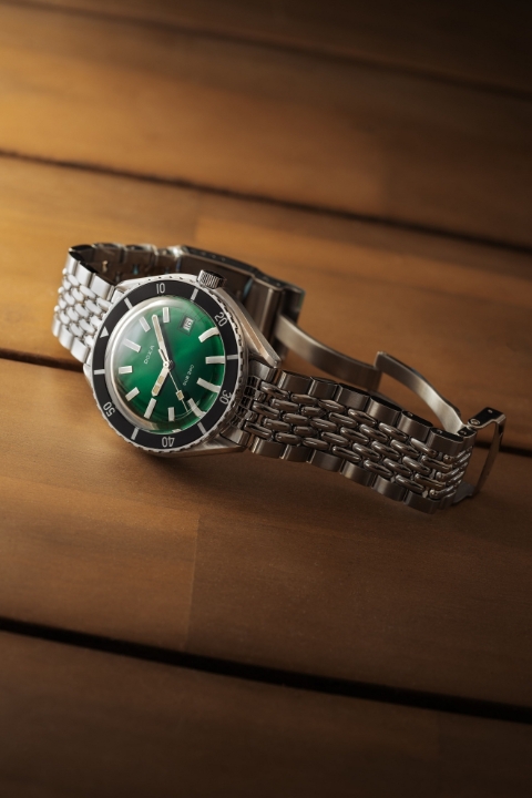 Uwagę przyciąga głęboko zielona tarcza z efektem szlifu słonecznego, która pięknie mieni się w świetle, nadając zegarkowi wyrafinowany wygląd. Datownik, umieszczony na godzinie trzeciej, uzupełnia funkcjonalność. Tarczę chroni niezwykle wytrzymałe szafirowe szkłoszkło z powłoką antyrefleksyjną, zapewniające doskonałą czytelność. Wskazówki, indeksy oraz bezel pokryte są szwajcarską masą luminescencyjną SuperLuminova®, która po naświetleniu gwarantuje perfekcyjną czytelność w każdych warunkach oświetleniowych, nawet w głębokiej wodzie.