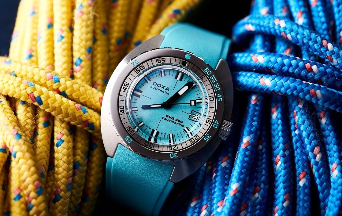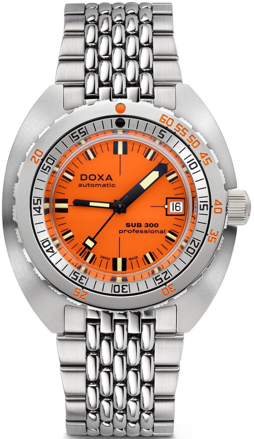 Doxa SUB 300 to żywa legenda, jedna z dwóch w portfolio marki. Jest to nowoczesna wersja tradycyjnego modelu zegarka do nurkowania wprowadzonego w 1967 roku. To właśnie ten model zdefiniował nowoczesny styl projektowania zegarków Doxa i ich praktyczne cechy. Jako pierwszy wprowadził nie tylko charakterystycznie ukształtowaną kopertę, ale także obrotowy w jednym kierunku pierścień, który oprócz skali minutowej zawiera także skalę służącą do obliczania bezpiecznej głębokości bez konieczności przystanków dekompresyjnych. Skala w tym przypadku jest ponumerowana w metrach. W modelu SUB 300 wprowadzono również radykalny pomarańczowy kolor tarczy, który okazał się bardzo praktyczny pod względem czytelności pod wodą. To właśnie kolor pomarańczowy stał się ulubionym kolorem Cousteau. Legendarny filmowiec i nurek tak bardzo pokochał ten zegarek, że jego firma, US Divers, została wyłącznym dystrybutorem marki Doxa w USA.
