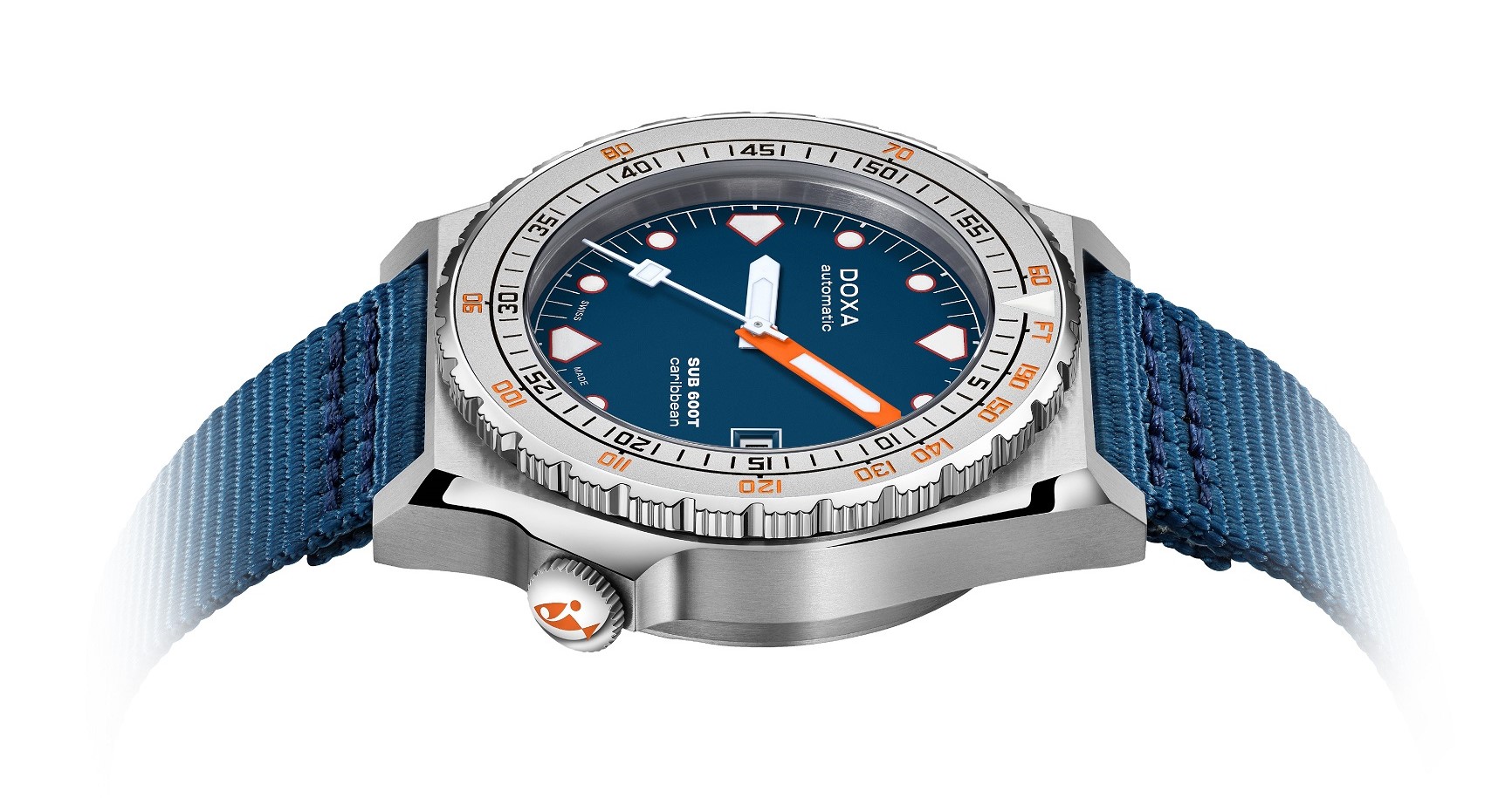 Koronka tym razem znajduje się na godzinie czwartej, a stalowa bransoleta ponownie ma ostro wycięte linie i jest trzyogniwowa. Alternatywą jest pasek NATO, który gwarantuje, że zegarek pozostanie na nadgarstku, nawet jeśli jeden z zawiasów ulegnie uszkodzeniu. Pomimo tych różnic, SUB 600T jest znów wyraźnie rozpoznawalny jako przedstawiciel swojej marki. Jest to zasługą zarówno bogatej gamy kolorów, jak i charakterystycznego kształtu pierścienia oraz podwójnej skali z minutami i bezpieczną głębokością do nurkowania bez konieczności dekompresji w torach. Można wybrać ramkę ze stalową lub ceramiczną wkładką. Model SUB 600T jest wodoodporny do głębokości 600 metrów.