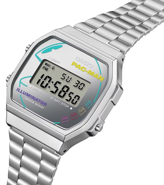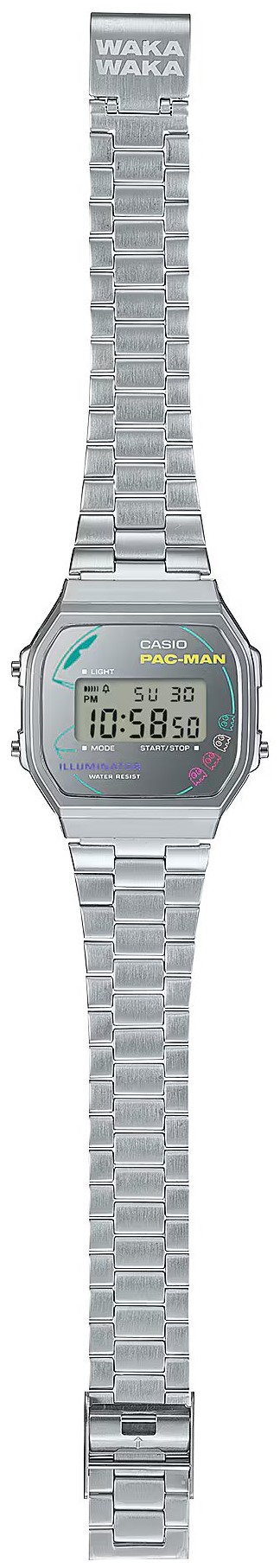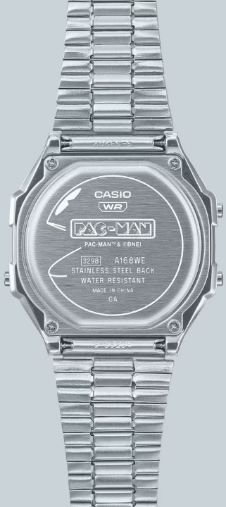 Casio Vintage PAC-MAN Collaboration A168WEPC-7AER to zegarek na baterie w stylu retro na stalowej bransolecie z przesuwanym zapięciem. Prostokątna obudowa z żywicy epoksydowej ma wymiary 36,3 x 38,6 milimetrów. Tarcza w kolorze srebrnym z cyfrowym wyświetlaczem z podświetleniem jest chroniona szkłem mineralnym.