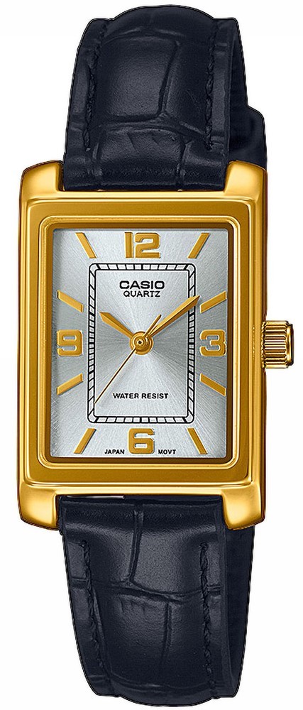 Kolekcja Casio LTP-1234PGL-7A2EF to elegancki damski zegarek kwarcowy z czarnym skórzanym paskiem ze sprzączką. Prostokątna koperta o wymiarach 21 x 32 milimetry wykonana jest z mosiądzu. Srebrna tarcza ze szlifem słonecznym i detalami w kolorze złota jest chroniona szkłem mineralnym. Zegarek jest odporny na przypadkowy kontakt z wodą np. podczas mycia rąk oraz podczas zachlapaniau.