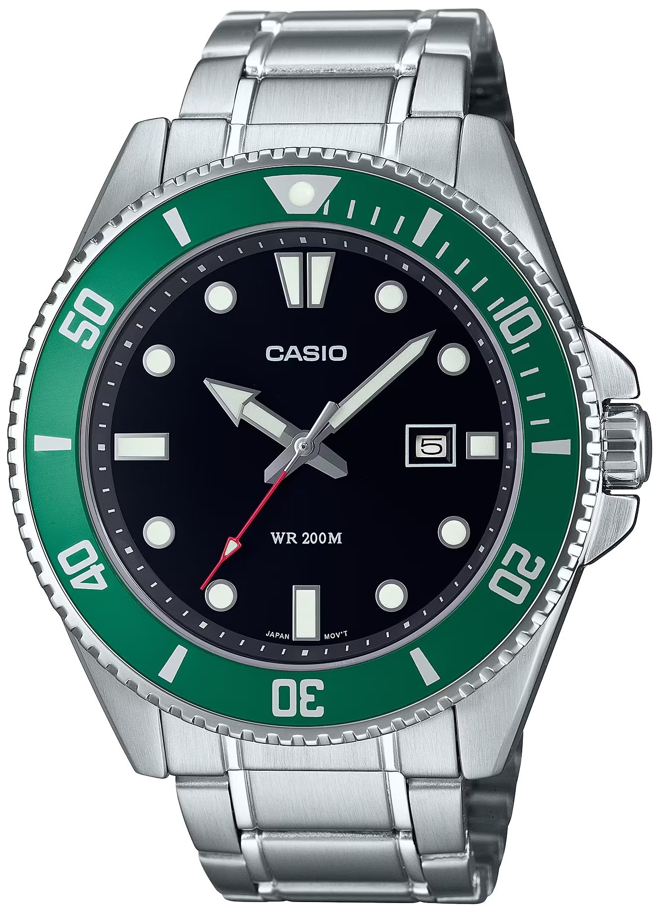 Kolekcja Casio MDV-107D-3AVEF to męski kwarcowy zegarek w klasycznym stylu ze stalową bransoletą ze składanym zapięciem. Koperta ze stali nierdzewnej ma średnicę 44,2 milimetra, zakręcaną koronkę i zieloną, jednokierunkowo obracający się aluminiową bezel ze skalą nurkową. Wyraźna czarna tarcza z wskaźnik daty trzeciej godziny jest chroniony przez szkło mineralne. Wyposażone wskazówki i indeksy warstwa luminescencyjna 20 ATM< /strong>< span style="background-color: var(--bs-body-bg); color: var(--bs-body-color); rodzina czcionek: var(--bs-body-font- rodzina); rozmiar czcionki: var(--bs-body-font-size); waga czcionki: var(--bs-body-font-grubość: var(-bs-body-text); -align); "> i dlatego nadają się do pływania i nurkowania.