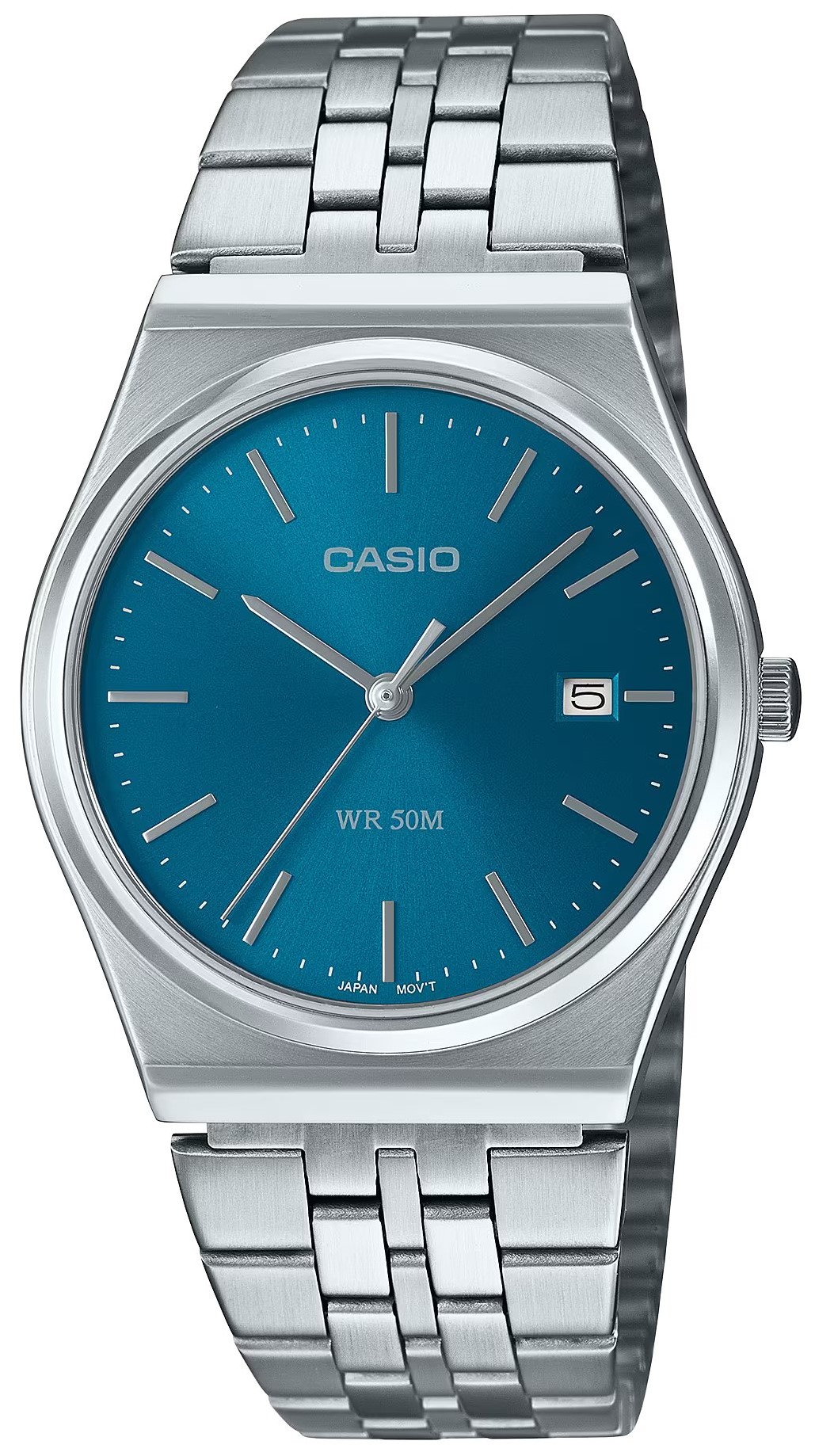 Kolekcja Casio MTP-B145D-2A2VEF to kwarcowy zegarek unisex o klasycznym designie z pięciorzędową stalową bransoletą ze składanym zapięciem i stalową kopertą średnicę 35 milimetrów. Niebieska tarcza ze szlifem słonecznym i datownikiem na godzinie trzeciej jest chroniona szkłem mineralnym. Wodoodporność zegarka wynosi 5 ATM, dzięki któremu jest odporny na zachlapania i zachlapania i opady.
