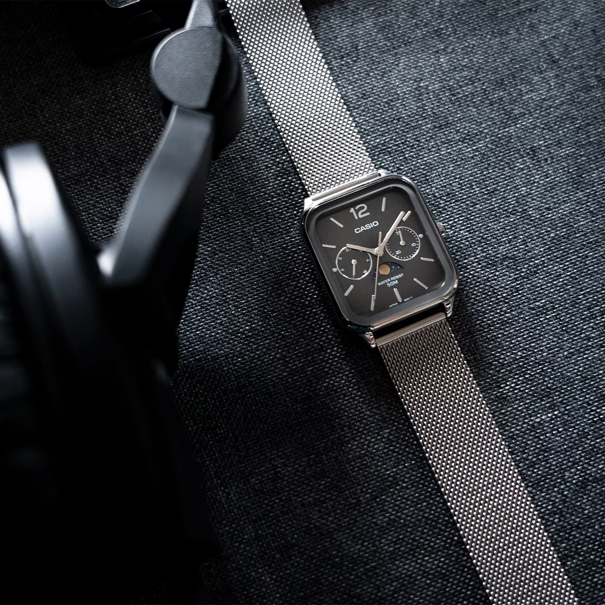 Casio Collection MTP-M305M-8AVER to kwarcowy zegarek unisex o eleganckim wyglądzie z prostokątną stalową kopertą o wymiarach 34 x 44,5 milimetrów, po której płynnie podąża mediolański mechanizm wykonany ze stali z zapięcie przesuwne. Szara tarcza ze wskaźnikami dnia, daty i faz księżyca jest ozdobiona pionowym szlifem i zabezpieczona szkłem mineralnym. Wodoodporność zegarka wynosi 5 ATM, dzięki któremu jest odporny na zachlapania i zachlapania i opady.