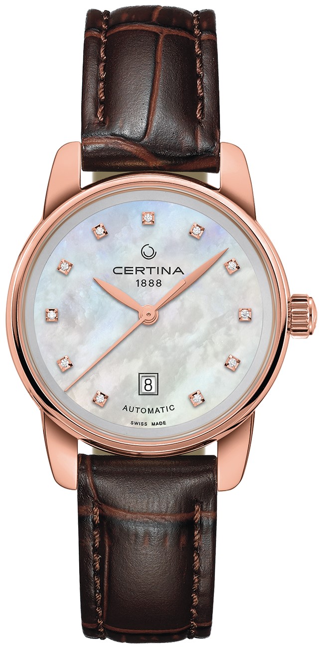Certina DS Podium Automatic C001.007.36.116.00 to damski zegarek automatyczny na brązowym skórzanym pasku z zapięciem motylkowym. Ten uniwersalny, elegancki zegarek można nosić na każdą okazję, dlatego jest to odpowiedni wybór do noszenia na co dzień. Koperta wykonana ze stali nierdzewnej pokrytej metodą PVD w kolorze różowego złota ma średnicę 29 milimetrów i przezroczysty dekiel. Tarcza z masy perłowej ze wskazaniem daty i 11 diamentami jest chroniona trwałym szkłem szafirowym z warstwą antyrefleksyjną, a jej piękno podkreśla się szczególnie w bezpośrednim świetle, gdy możemy zaobserwować grę barw masy perłowej. Zegarek napędzany jest mechanizmem ETA 2671 z naciągiem automatycznym i rezerwą chodu wynoszącą około 38 godzin. Ten mechanizm z funkcją hakowania można w razie potrzeby nakręcić również ręcznie za pomocą sygnowanej koronki. W modelu zastosowano technologięDS (Double Security), stosowaną i doskonaloną od 1959 roku, dzięki której zegarek ma zwiększoną odporność na uderzenia i wodę. Wodoodporność zegarka wynosi 10 ATM i dlatego nadaje się do pływania i snorkelingu.