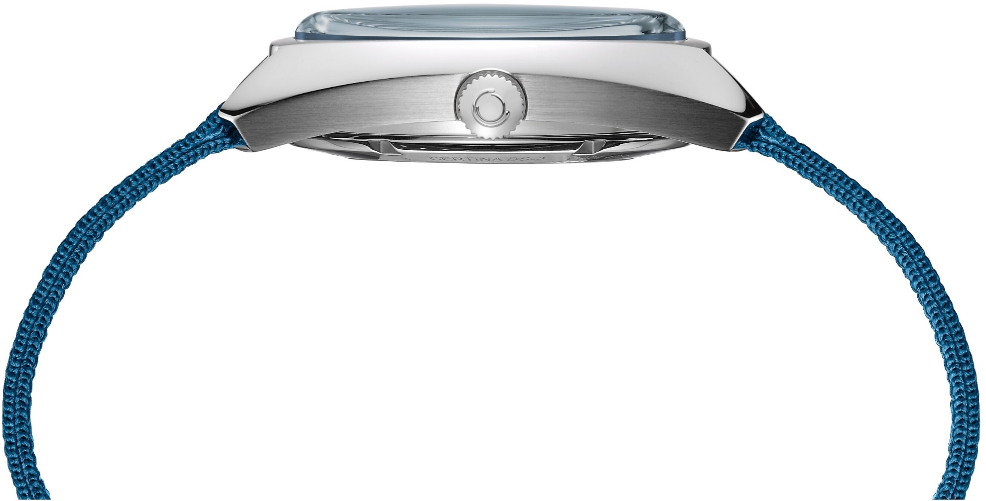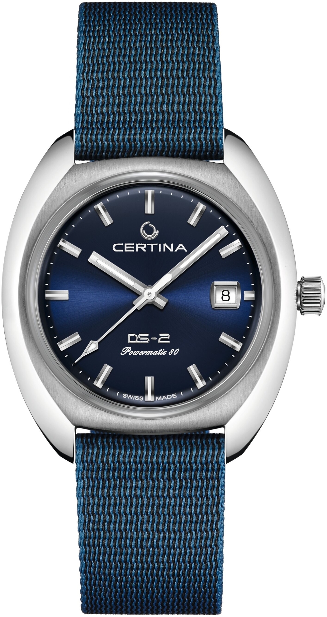 Certina DS-2 C024.407.18.041.00 to męski zegarek automatyczny na niebieskim tekstylnym pasku, wykonany z materiału #tide ocean – plastiku pochodzącego z recyklingu, wyłowionego z morza. Zegarek jest następcą popularnego i niezawodnego modelu DS-2 z 1968 roku. Koperta ze stali nierdzewnej w kształcie tonneau, z elipsami zakończonymi na obu końcach, ma średnicę 40 milimetrów i przezroczysty dekiel. Niebieską tarczę ze szlifem słonecznym i wskazaniem daty chroni wypukłe szkło szafirowe z powłoką antyrefleksyjną. Vintage charakter zegarka podkreślają kwadratowe wskazówki i indeksy godzin pokryte powłoką luminescencyjną Super-LumiNova®, która gwarantuje doskonałą czytelność w warunkach słabego oświetlenia. Zegarek napędzany jest mechanizmem Powermatic 80.611 z naciągiem automatycznym i rezerwą chodu wynoszącą około 80 godzin. Kaliber jest wyposażony w koło zamachowe Nivachron™, które jest specjalnym materiałem antymagnetycznym, dzięki któremu zegarek jest wysoce odporny na pola magnetyczne. Mechanizm ten z funkcją hakowania można w razie potrzeby nakręcić także ręcznie za pomocą zakręcanej koronki. W modelu zastosowano technologię DS (Double Security), stosowaną i doskonaloną od 1959 roku, dzięki której zegarek ma zwiększoną odporność na uderzenia i wodę. Zegarek jest wodoodporny do 20 ATM i jest odpowiednim wyborem do snorkelingu i nurkowania.