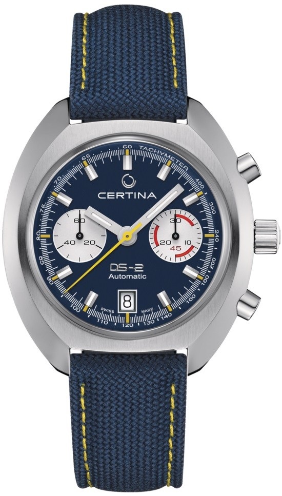 Certina DS-2 Chronograph Automatic C024.462.18.041.00 to męski zegarek automatyczny na tekstylnym pasku podszytym skórą z zapięciem motylkowym, który inspirowany jest modelem DS-2, którego walory sprawdzały się także podczas wyprawy na Mount Everest. Koperta ze stali nierdzewnej w kształcie tonneau, z elipsą zakończoną na obu końcach, ma średnicę 43,36 milimetra i przezroczysty dekiel. Sportowy charakter zegarka dopełnia niebieska tarcza z datownikiem i funkcją chronografu, chroniona wypukłym szkłem szafirowym z warstwą antyrefleksyjną. Zastosowane indeksy godzinowe wraz ze wskazówkami pokryte są powłoką luminescencyjną Super-LumiNova®, która gwarantuje doskonałą czytelność w warunkach słabego oświetlenia. Elementy w kolorze żółtym znajdziemy na tarczy i pasku. Zegarek napędzany jest mechanizmem ETA A05.231 z naciągiem automatycznym i rezerwą chodu wynoszącą około 68 godzin. Kaliber wyposażony jest w krzemowe włosie koła zamachowego, które zapewnia zegarkowi dużą odporność na pola magnetyczne. Ten mechanizm z funkcją hakowania można w razie potrzeby nakręcić ręcznie, używając sygnowanej koronki. W modelu zastosowano technologię DS (Double Security), stosowaną i doskonaloną od 1959 roku, dzięki której zegarek ma zwiększoną odporność na uderzenia i wodę. Zegarek jest wodoodporny do 20 ATM i jest odpowiednim wyborem do snorkelingu i nurkowania.