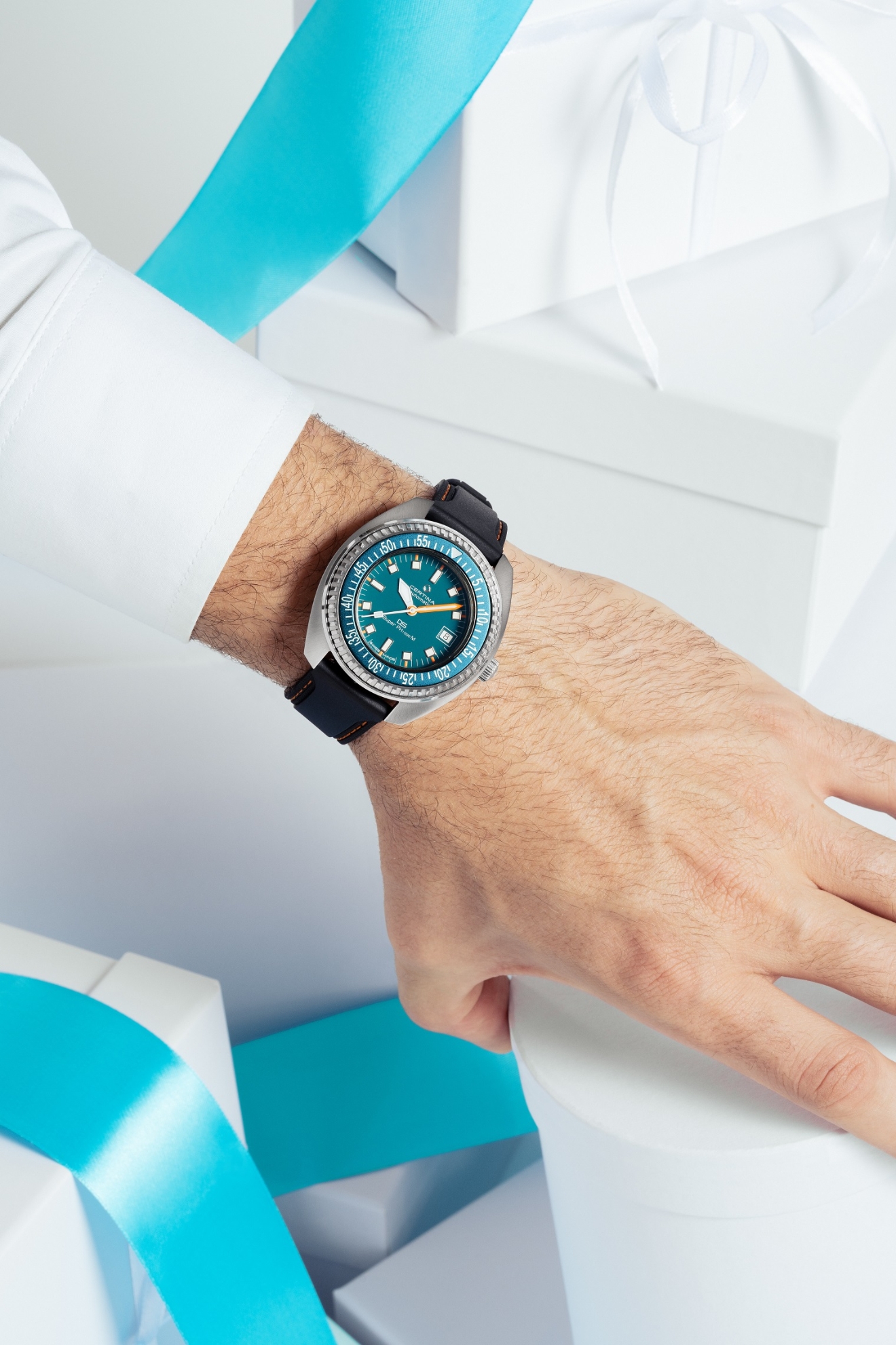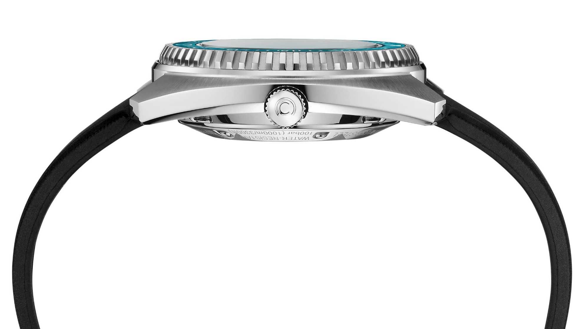 DS SUPER PH1000M z pewnością wyróżnia się z tłumu. Koperta ze stali nierdzewnej ma delikatnie zakrzywiony kształt beczki o wymiarach 43,5 x 42 milimetry. Zawór uwalniający hel znajduje się na godzinie 9 i jest przeznaczony do użytku przez profesjonalnych nurków. Karbowana, podwyższona konstrukcja obrotowej ramki nie tylko ułatwia obsługę, ale także dodaje zegarkowi wizualnej głębi. Szerokie indeksy i wskazówki z warstwą Super-LumiNova® zapewniają maksymalną czytelność w ciemności.
