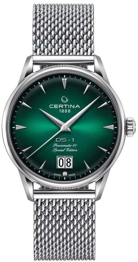 Certina DS-1 Big Date 60th Anniversary Special Edition C029.426.11.091.60 to męski automatyczny metalowy zegarek mediolański z zapięciem motylkowym, inspirowany pierwszą koncepcją zegarka DS wyprodukowaną przez firmę Certina w 1960 roku. Koperta ze stali nierdzewnej w połączeniu szlifowanie i polerowanie ma średnicę 41 milimetrów. Motyw deklu wskazuje, że jest to edycja specjalna wydana z okazji 60. rocznicy wprowadzenia koncepcji DS. Zielona, gradientowa tarcza ze wskazaniem daty w stylu Big Date na godzinie szóstej jest pokryta trwałym szkłem szafirowym z warstwą antyrefleksyjną. Zastosowane indeksy godzin uzupełniają eleganckie wskazówki typu dauphine. Zegarek napędzany jest mechanizmem mechanicznym Powermatic 80.651 z naciągiem automatycznym i rezerwą chodu wynoszącą około 80 godzin. Kaliber wyposażony jest w mechanizm Nivachron™ koło zamachowe, czyli specjalny materiał antymagnetyczny, dzięki któremu zegarek jest bardzo odporny na działanie pól magnetycznych. Mechanizm ten z funkcją hakowania można również nakręcić ręcznie, w razie potrzeby za pomocą sygnowanej koronki. W modelu zastosowano technologię DS (Double Security), stosowaną i doskonaloną od 1959 roku, dzięki której zegarek ma zwiększoną odporność na uderzenia i wodę. Wodoodporność zegarka wynosi 10 ATM i dlatego nadaje się do pływania i snorkelingu.