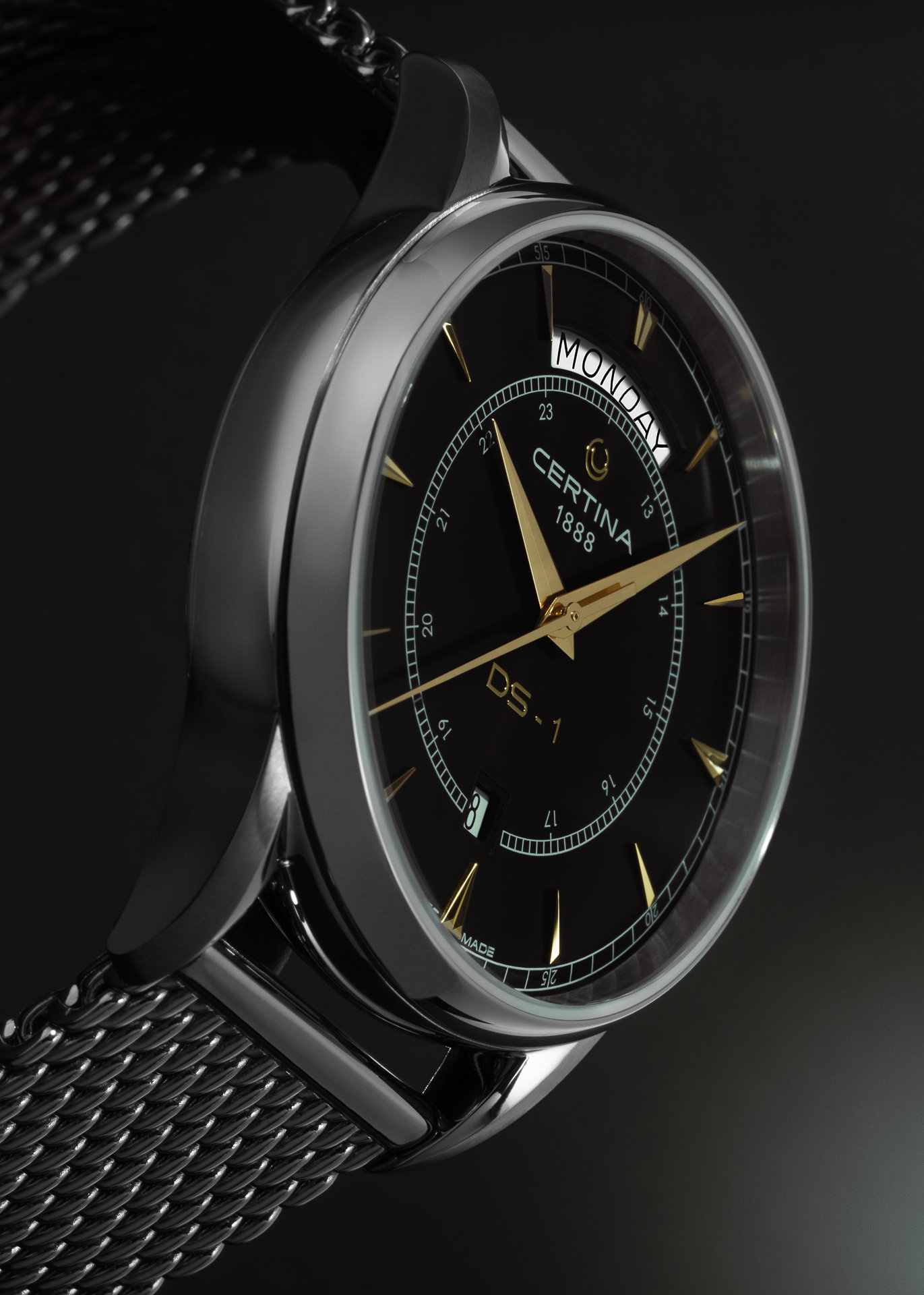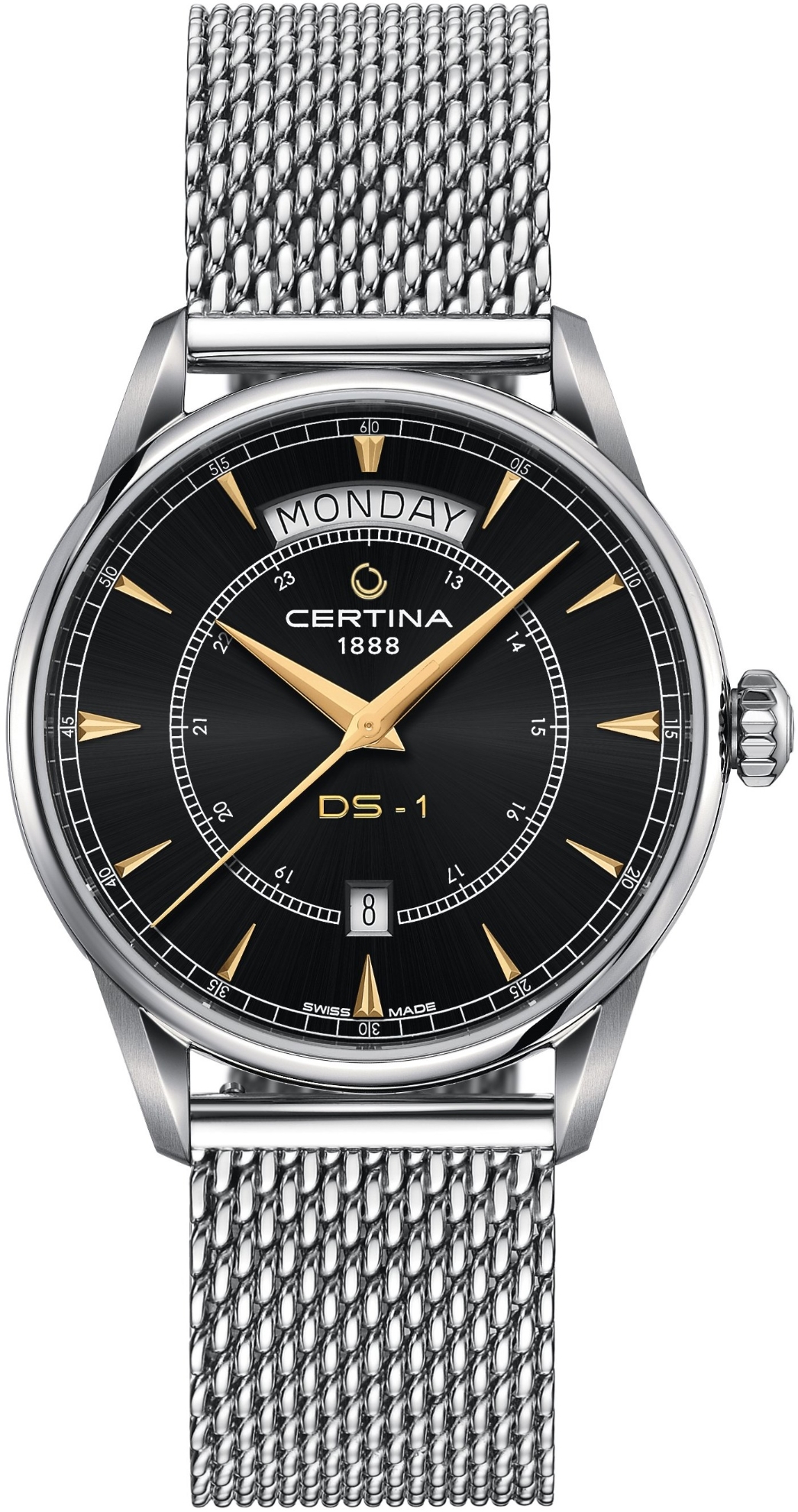 Certina DS-1 Day Date C029.430.11.051.00 to męski zegarek automatyczny na stalowej bransolecie mediolańskej z zapięciem motylkowym, inspirowany pierwszą koncepcją zegarka DS wyprodukowaną przez firmę Certina w 1960 roku. Koperta ze szczotkowanej i polerowanej stali nierdzewnej ma średnicę 40 milimetrów i przezroczysty dekiel. Czarna tarcza ze wskazaniem daty pokryta wytrzymałym wypukłym szkiełkiem szafirowym z powłoką antyrefleksyjną, przyciąga wzrok od pierwszego wejrzenia zaokrąglonym wskaźnikiem dnia tygodnia na godzinie dwunastej. Zastosowane indeksy godzinowe wykończone są w kolorze złotym z eleganckimi wskazówkami typu dauphine. Zegarek napędzany jest mechanizmem ETA 2834-2 z naciągiem automatycznym i rezerwą chodu wynoszącą około 38 godzin. Ten mechanizm z funkcją hakowania można w razie potrzeby nakręcić również ręcznie za pomocą sygnowanej koronki. W modelu zastosowano technologię DS (Double Security), stosowaną i doskonaloną od 1959 roku, dzięki której zegarek ma zwiększoną odporność na uderzenia i wodę. Wodoodporność zegarka wynosi 10 ATM i dlatego nadaje się do pływania i snorkelingu.