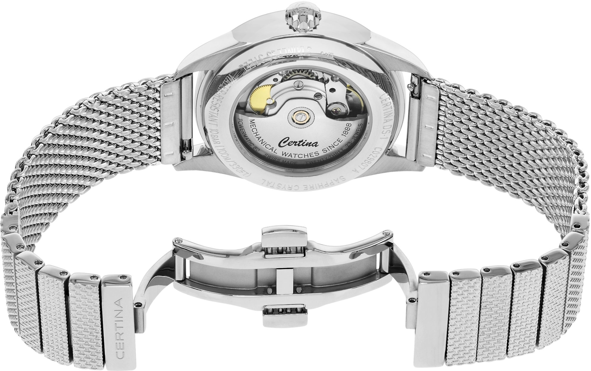 Certina DS-1 Powermatic 80 C029.807.11.031.02 to męski automatyczny metalowy zegarek mediolański z zapięciem motylkowym, inspirowany pierwszą koncepcją zegarka DS wyprodukowaną przez firmę Certina w 1960 roku. Koperta ze szczotkowanej i polerowanej stali nierdzewnej ma średnicę 40 milimetry i przezroczysta deklua. Srebrną tarczę z efektem słońca i wskazaniem daty pokryto trwałym szkłem szafirowym z powłoką antyrefleksyjną. Zastosowane indeksy godzinowe uzupełniają eleganckie wskazówki w kolorze błękitnego dauphine. Zegarek napędzany jest mechanizmem Powermatic 80.111 z naciągiem automatycznym i rezerwą chodu wynoszącą około 80 godzin. Ten mechanizm z funkcją hakowania może w razie potrzeby można je również nawinąć ręcznie za pomocą podpisanej koronki. W modelu zastosowano technologię DS (Double Security), stosowaną i doskonaloną od 1959 roku, dzięki której zegarek ma zwiększoną odporność na uderzenia i wodę. Wodoodporność zegarka wynosi 10 ATM i dlatego nadaje się do pływania i snorkelingu. W zestawie zapasowy brązowy skórzany pasek z cierniową klamrą.