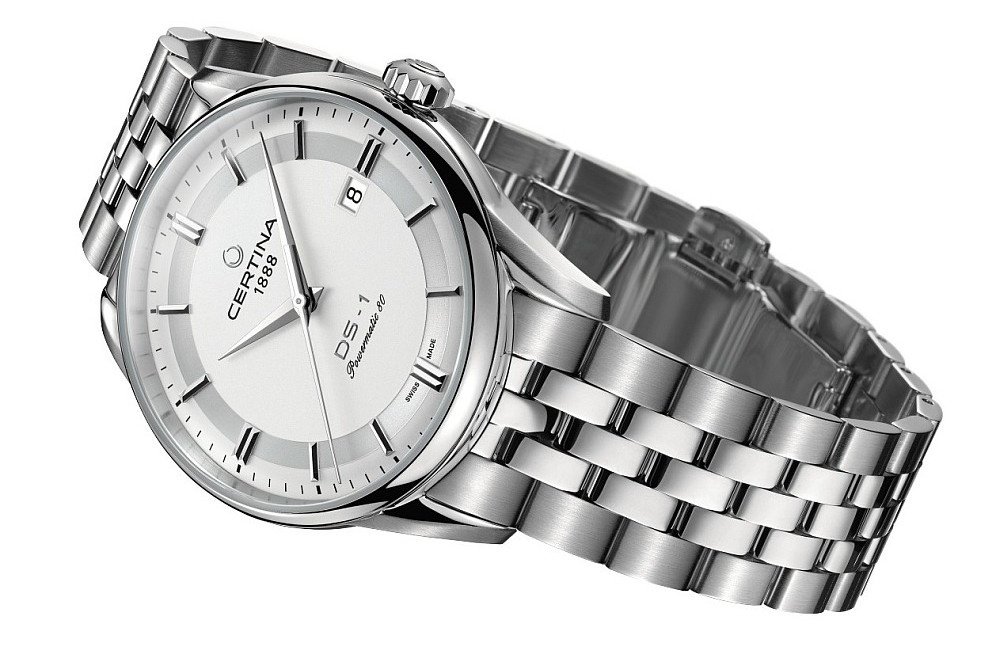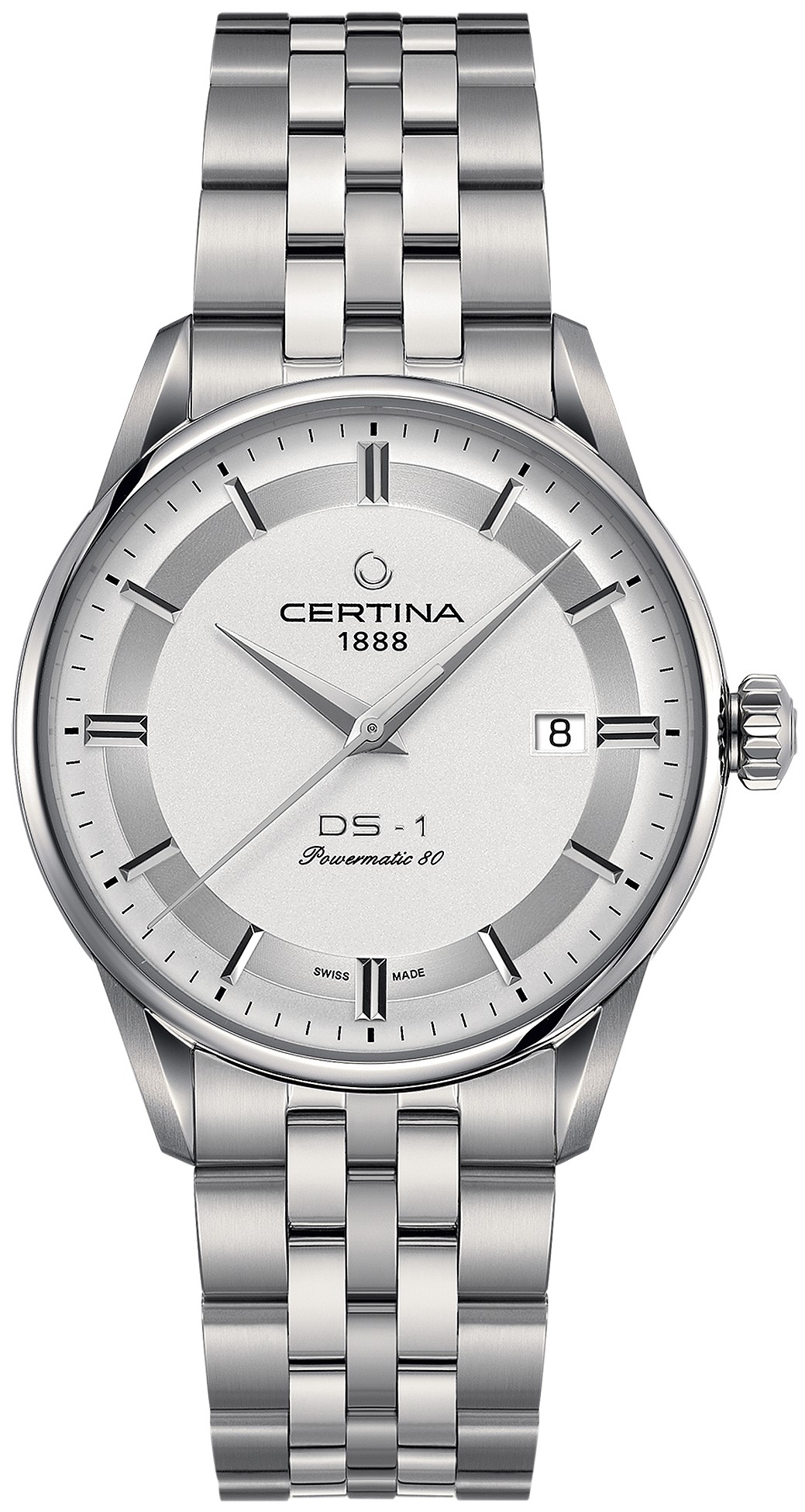 Certina DS-1 Powermatic 80 C029.807.11.031.60 to męski zegarek automatyczny na szczotkowanej i polerowanej metalowej bransolecie z zapięciem motylkowym, inspirowany pierwszą koncepcją zegarka DS wyprodukowaną przez firmę Certina w 1960 roku. Koperta ze stali nierdzewnej ma średnica 40 milimetrów i