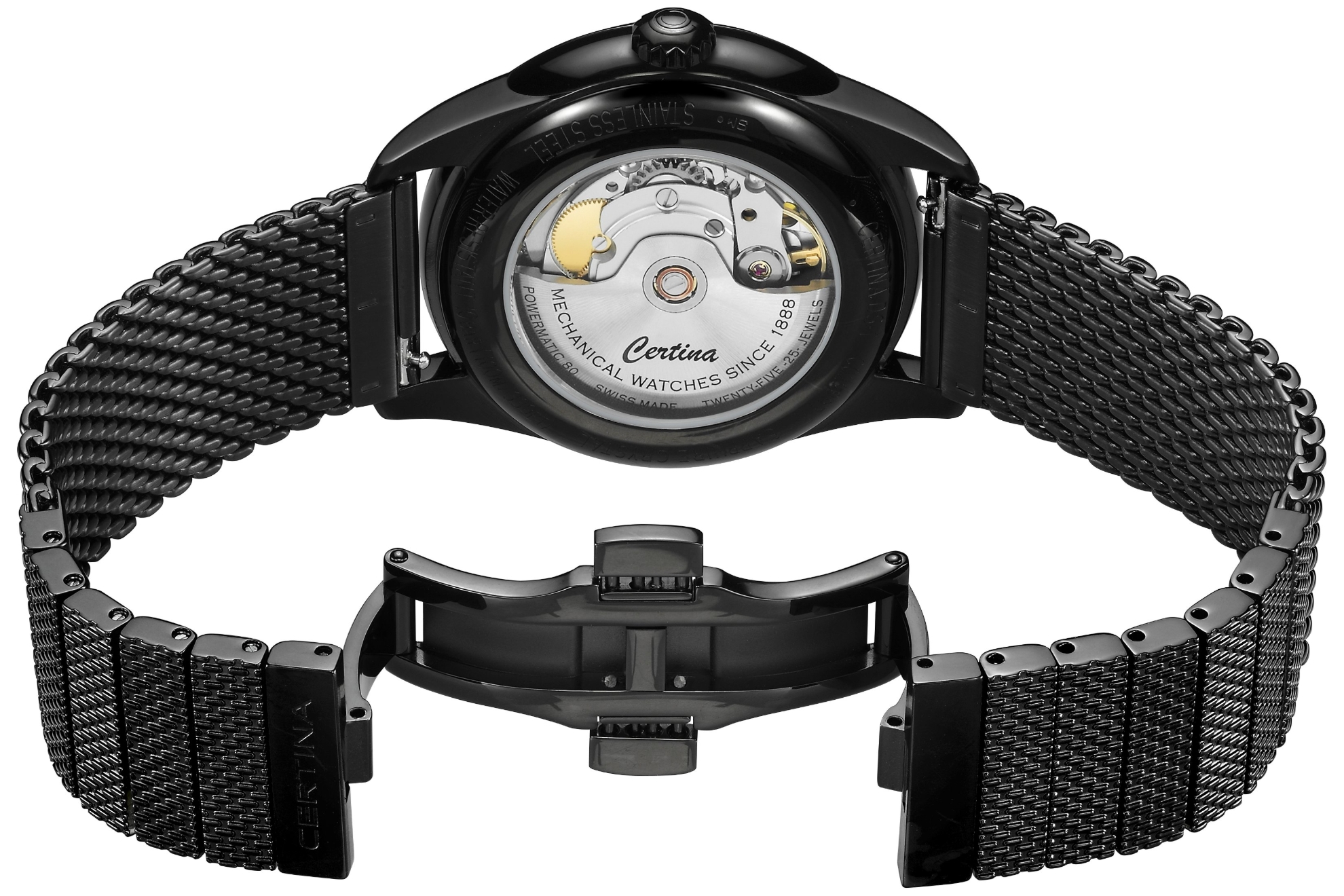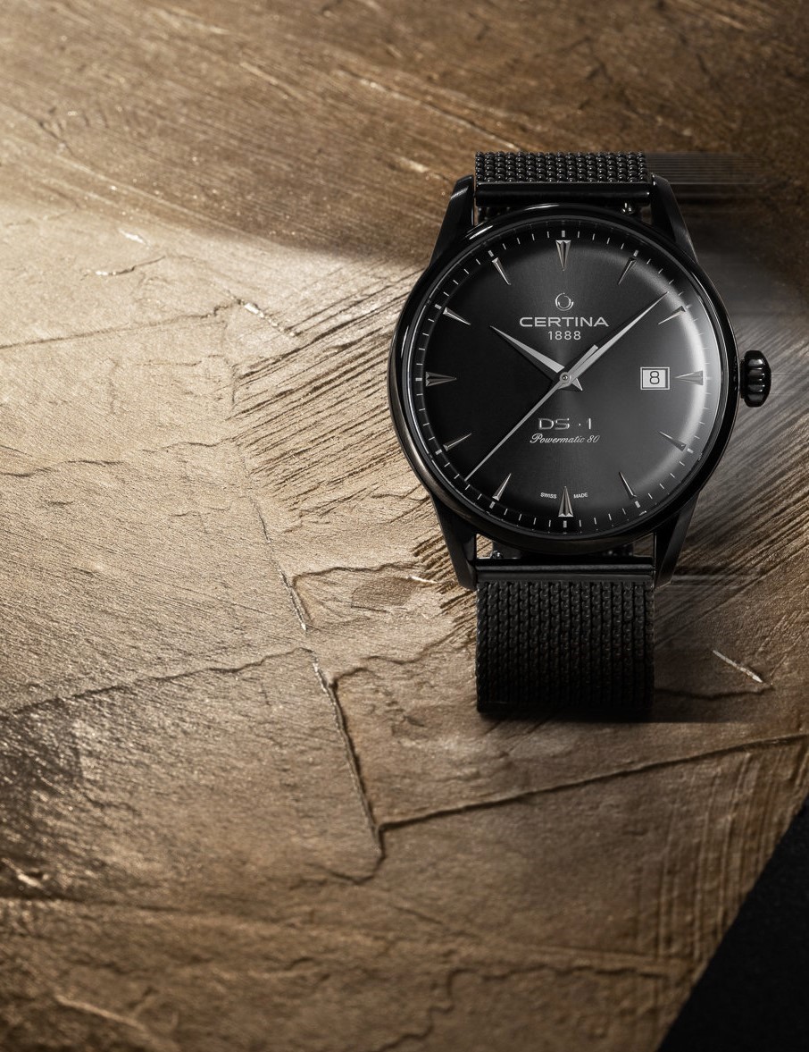 Certina DS-1 Powermatic 80 C029.807.33.051.00 to męski zegarek z automatycznym mechanizmem mediolańskim z wykończeniem PVD w kolorze czarnym i zapięciem motylkowym, inspirowany pierwszą koncepcją zegarka DS wyprodukowaną przez firmę Certina w 1960 roku. Koperta ze stali nierdzewnej z wykończeniem PVD w kolorze czarnym ma średnica 40 milimetrów i przezroczysta deklua. Czarną tarczę z efektem słońca i datownikiem pokryto wytrzymałym szkłem szafirowym z powłoką antyrefleksyjną. Zastosowane indeksy godzinowe wraz ze wskazówkami typu dauphine wykończone są w kolorze złotym. Zegarek napędzany jest mechanizmem mechanicznym Powermatic 80.611 z naciągiem automatycznym i rezerwą chodu wynoszącą około 80 godzin. Kaliber wyposażony jest w mechanizm Nivachron™ koło zamachowe, czyli specjalny materiał antymagnetyczny, dzięki któremu zegarek jest bardzo odporny na działanie pól magnetycznych. Mechanizm ten z funkcją hakowania można również nakręcić ręcznie, w razie potrzeby za pomocą sygnowanej koronki. W modelu zastosowano technologię DS (Double Security), stosowaną i doskonaloną od 1959 roku, dzięki której zegarek ma zwiększoną odporność na uderzenia i wodę. Wodoodporność zegarka wynosi 10 ATM i dlatego nadaje się do pływania i snorkelingu.