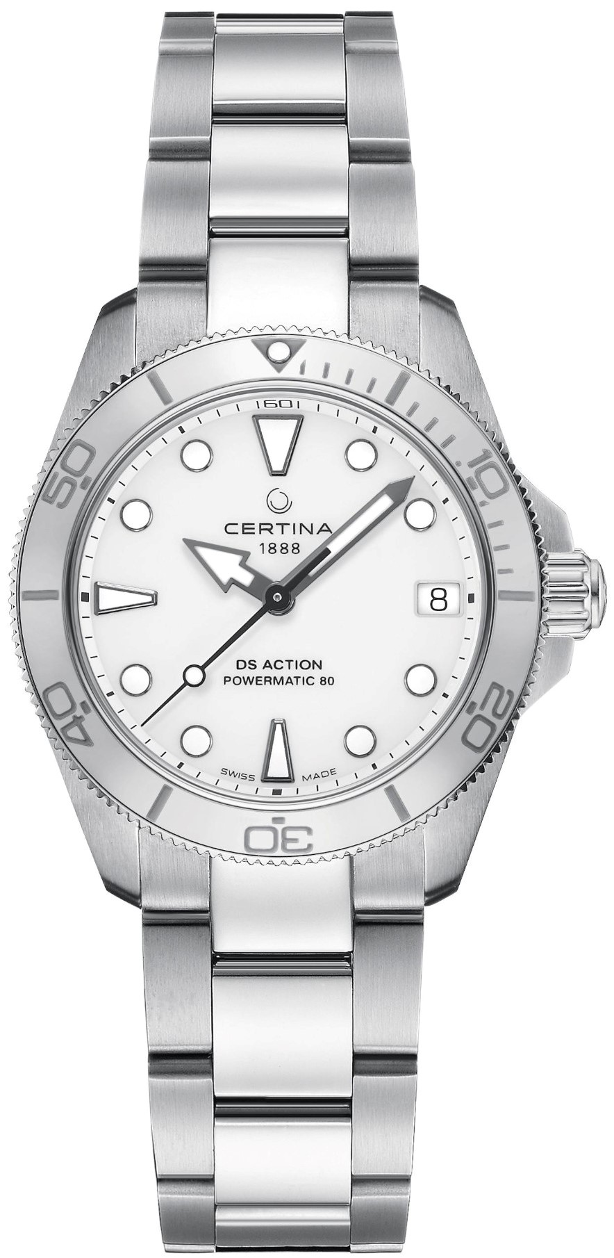 Certina DS Action Lady C032.007.11.011.00 to damski zegarek automatyczny na metalowej bransolecie z zapięciem motylkowym. Koperta ze stali nierdzewnej ma średnicę 34,5 milimetra, jednokierunkowo obracający się bezel z ceramiczną wkładką ze skalą do nurkowania oraz dekiel oznaczony logo żółwia, które reprezentuje solidność i trwałość zegarków Certina. Biała tarcza ze wskazaniem daty jest chroniona wytrzymałym szkłem szafirowym z powłoką antyrefleksyjną. Zastosowane indeksy godzinowe i wskazówki pokryte są powłoką luminescencyjną Super-LumiNova®, która gwarantuje doskonałą czytelność w warunkach słabego oświetlenia. Zegarek napędzany jest mechanizmem Powermatic 80.611 z naciągiem automatycznym i rezerwą chodu wynoszącą około 80 godzin. Kaliber wyposażony jest w koło zamachowe Nivachron, które jest specjalnym materiałem antymagnetycznym, dzięki któremu zegarek jest wysoce odporny na pola magnetyczne. Mechanizm ten z funkcją hakowania można w razie potrzeby nakręcić także ręcznie za pomocą zakręcanej koronki. W modelu zastosowano technologię DS(Double Security), stosowaną i doskonaloną od 1959 roku, dzięki której zegarek ma zwiększoną odporność na uderzenia i wodę. Wodoodporność zegarka wynosi 30 ATM , a dzięki certyfikatowi ISO 6425 jest odpowiednim wyborem do nurkowania według wskazań przyrządów.