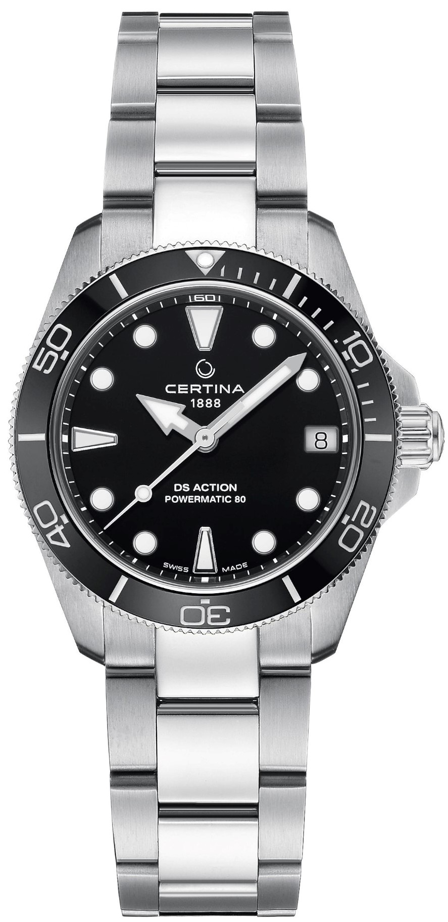 Certina DS Action Lady C032.007.11.051.00 to damski zegarek automatyczny na metalowej bransolecie z zapięciem motylkowym. Koperta ze stali nierdzewnej ma średnicę 34,5 milimetra, jednokierunkowo obracający się bezel z ceramiczną wkładką ze skalą do nurkowania oraz dekiel oznaczony logo żółwia, które reprezentuje solidność i trwałość zegarków Certina. Czarną tarczę ze wskazaniem daty chroni trwałe szkło szafirowe z powłoką antyrefleksyjną. Zastosowane indeksy godzinowe i wskazówki pokryte są powłoką luminescencyjną Super-LumiNova®, która gwarantuje doskonałą czytelność w warunkach słabego oświetlenia. Zegarek napędzany jest mechanizmem Powermatic 80.611 z naciągiem automatycznym i rezerwą chodu wynoszącą około 80 godzin. Kaliber wyposażony jest w koło zamachowe Nivachron, które jest specjalnym materiałem antymagnetycznym, dzięki któremu zegarek jest wysoce odporny na pola magnetyczne. Mechanizm ten z funkcją hakowania można w razie potrzeby nakręcić także ręcznie za pomocą zakręcanej koronki. W modelu zastosowano technologię DS(Double Security), stosowaną i doskonaloną od 1959 roku, dzięki której zegarek ma zwiększoną odporność na uderzenia i wodę. Wodoodporność zegarka wynosi 30 ATM , a dzięki certyfikatowi ISO 6425 jest odpowiednim wyborem do nurkowania według wskazań przyrządów.