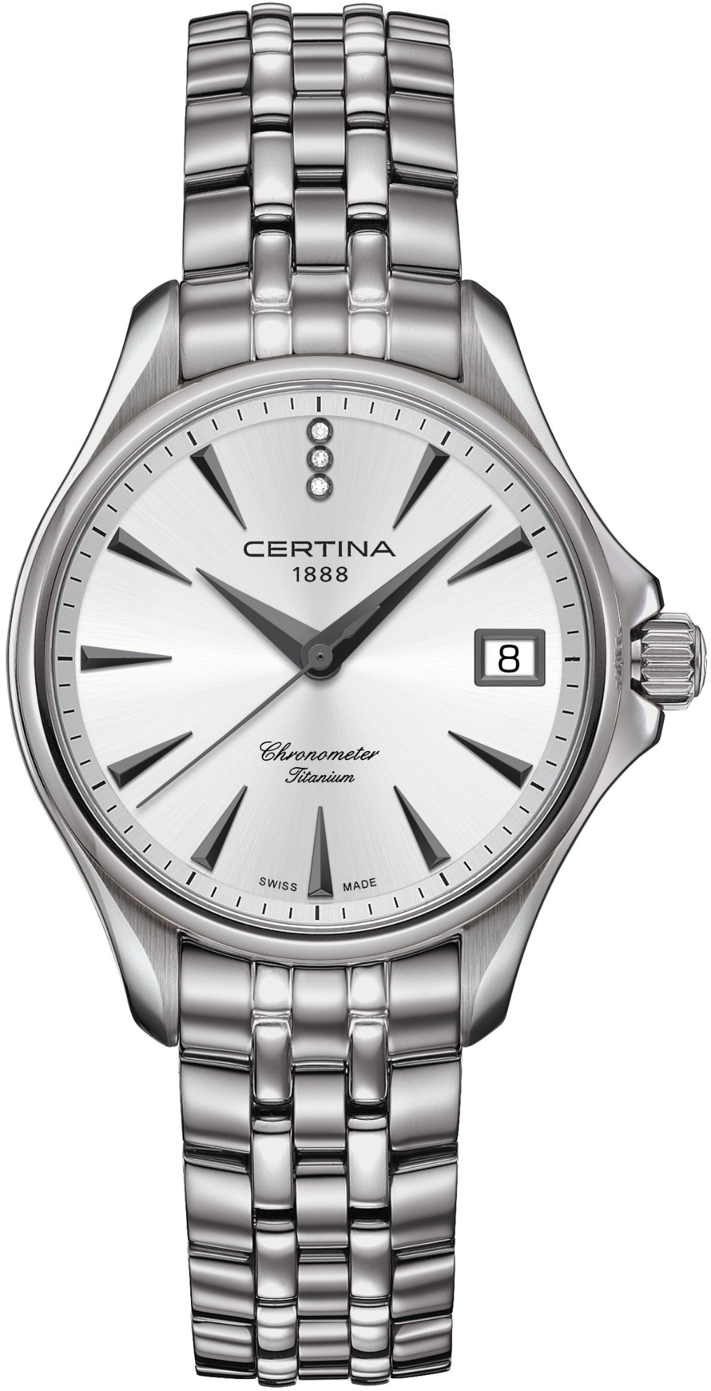 Certina DS Action Lady Chronometer C032.051.44.036.00 to damski zegarek na baterię na tytanowej bransolecie z zapięciem motylkowym. Tytanowa koperta ma średnicę 33,8 milimetra, zakręcaną koronkę i dekiel oznaczony logo żółwia, które reprezentuje solidność i długowieczność zegarków Certina. Srebrną tarczę ze szlifem słonecznym i datownikiem chroni trwałe szkło szafirowe z powłoką antyrefleksyjną. Zastosowane indeksy godzinowe uzupełniają eleganckie wyraziste wskazówki i trzy diamenty na godzinie dwunastej. Zegarek napędza niezawodny mechanizm kwarcowy ETA F06.411 z technologią Precidrive z dokładnością +/- 10 sekund na rok i sygnalizacją niskiego poziomu baterii. Zegarki posiadające certyfikat COSC, będący gwarancją dużej dokładności, noszą oznaczenie „Chronometr”. W modelu zastosowano technologię DS (Double Security), stosowaną i doskonaloną od 1959 roku, dzięki której zegarek ma zwiększoną odporność na uderzenia i wodę. Wodoodporność zegarka wynosi 20 ATM i dlatego jest odpowiednim wyborem do snorkelingu i nurkowania.