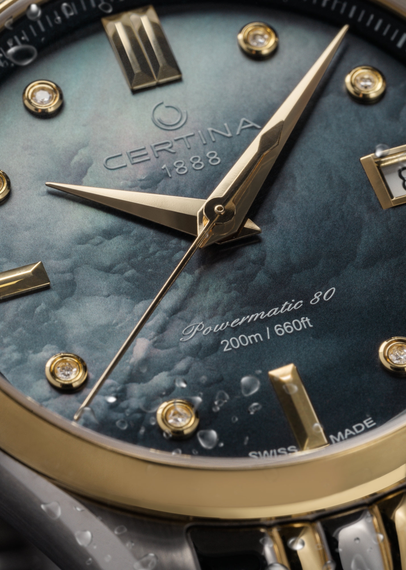 Certina DS Action Lady Powermatic 80 C032.207.22.126.00 to damski zegarek automatyczny na metalowej dwukolorowej bransolecie z zapięciem motylkowym. Koperta ze stali nierdzewnej ma średnicę 34,5 milimetra, zewnętrzna ramka i koronka pokryte są złotym PVD a całość zabezpieczona przezroczystym deklem. Niebieska tarcza z masy perłowej ze wskazaniem daty jest chroniona trwałym szkłem szafirowym z powłoką antyrefleksyjną, Jej piękno szczególnie ujawnia się w bezpośrednim świetle, kiedy można podziwiać grę kolorów masy perłowej. Zastosowane indeksy godzin ze wskazówkami w kolorze złota uzupełnione są 8 diamentami. Zegarek napędzany jest mechanizmem Powermatic 80.611 z naciągiem automatycznym i rezerwą chodu wynoszącą około 80 godzin. Kaliber ten jest wyposażony w koło zamachowe Nivachron™, czyli specjalny materiał antymagnetyczny, dzięki któremu zegarek jest wysoce odporny na pola magnetyczne. Jest to mechanizm z funkcją hakowania, który w razie potrzeby można również nakręcić ręcznie za pomocą sygnowanej koronki. W modelu zastosowano technologię DS (Double Security), stosowaną i doskonaloną od 1959 roku, dzięki której zegarek jest bardziej odporny na uderzenia oraz ma zwiększoną wodoodporność. Wodoodporność zegarka wynosi 20 ATM, co czyni go odpowiednim wyborem do snorkelingu i nurkowania.