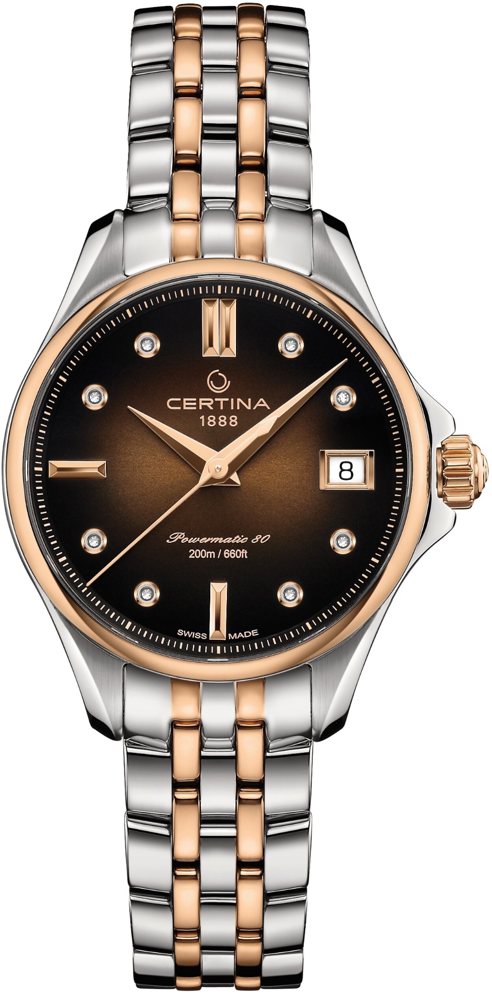 Certina DS Action Lady Powermatic 80 C032.207.22.296.00 to damski zegarek automatyczny na metalowej dwukolorowej bransolecie z zapięciem motylkowym. Koperta ze stali nierdzewnej ma średnicę 34,5 milimetra, zewnętrzną bezel i koronkę pokryte różowym złotem PVD oraz przezroczysty dekiel. Brązowa, gradientowa tarcza ze wskazaniem daty jest chroniona wytrzymałym szkłem szafirowym z powłoką antyrefleksyjną. Zastosowane indeksy godzin ze wskazówkami w kolorze różowego złota uzupełnione są 8 diamentami. Zegarek napędzany jest mechanizmem Powermatic 80.611 z naciągiem automatycznym i rezerwą chodu wynoszącą około 80 godzin. Kaliber ten jest wyposażony w koło zamachowe Nivachron™, czyli specjalny materiał antymagnetyczny, dzięki któremu zegarek jest wysoce odporny na pola magnetyczne. Jest to mechanizm z funkcją hakowania, który w razie potrzeby można również nakręcić ręcznie za pomocą sygnowanej koronki. W modelu zastosowano technologię DS (Double Security), stosowaną i doskonaloną od 1959 roku, dzięki której zegarek jest bardziej odporny na uderzenia oraz ma zwiększoną wodoodporność. Wodoodporność zegarka wynosi 20 ATM, co czyni go odpowiednim wyborem do snorkelingu i nurkowania.
