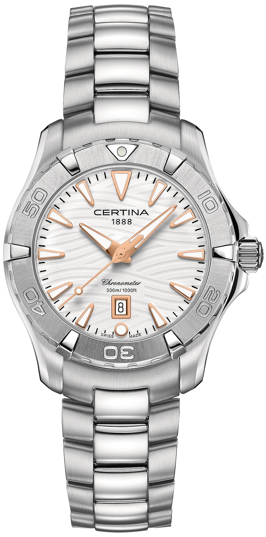 Certina DS Action Lady Chronometer C032.251.11.011.01 to damski zegarek na baterię na metalowej bransolecie ze składanym zapięciem. Koperta ze szczotkowanej i polerowanej stali nierdzewnej ma średnicę 34,3 milimetra, zakręcaną koronkę oraz jednokierunkowo obracający się bezel z polerowanymi lub satynowanymi elementami i skalą nurkową. Dekiel oznaczony logo żółwia symbolizuje solidność i trwałość zegarków Certina. Biała tarcza z motywem fali i datownikiem jest chroniona wytrzymałym szkłem szafirowym z powłoką antyrefleksyjną. Zastosowane indeksy godzinowe wraz ze wskazówkami pokryte są powłoką luminescencyjną Super-LumiNova®, która gwarantuje doskonałą czytelność w warunkach słabego oświetlenia. Zegarek napędza niezawodny mechanizm kwarcowy ETA F04.411 z technologią Precidrive z dokładnością +/- 10 sekund na rok i sygnalizacją niskiego poziomu baterii. Zegarki posiadające certyfikat COSC, będący gwarancją dużej dokładności, noszą oznaczenie „Chronometr”. W modelu zastosowano technologię DS (Double Security), stosowaną i doskonaloną od 1959 roku, dzięki której zegarek ma zwiększoną odporność na uderzenia i wodę. Wodoodporność zegarka wynosi 30 ATM, co czyni go odpowiednim wyborem do snorkelingu i głębokiego nurkowania.