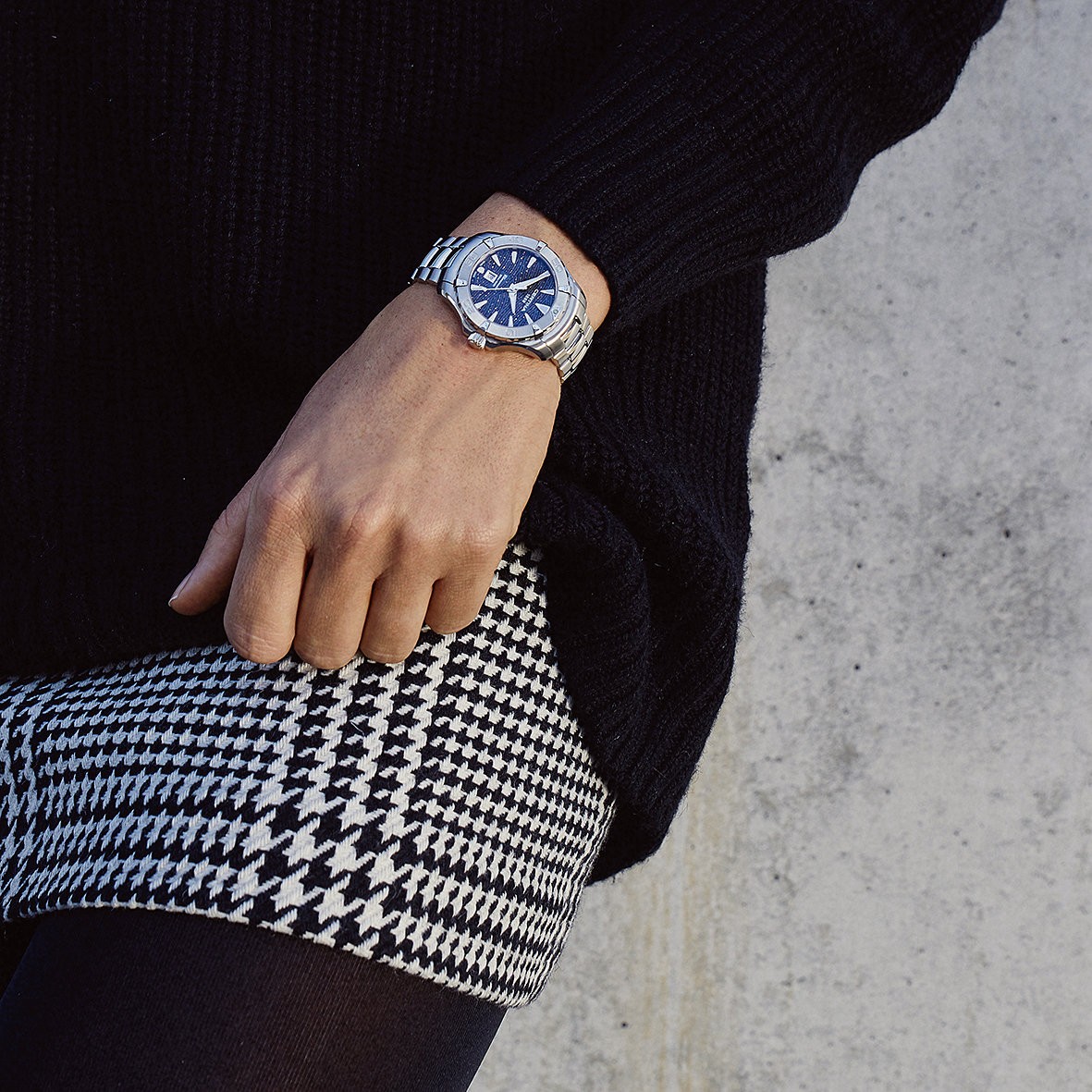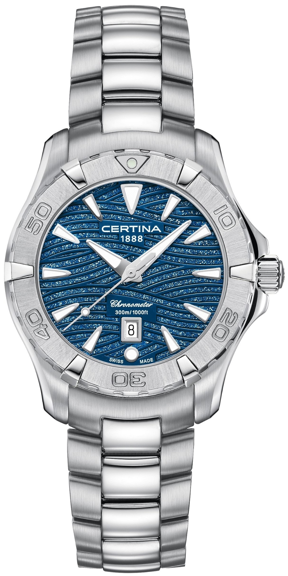 Certina DS Action Lady Chronometer C032.251.11.041.09 to damski zegarek na baterię na metalowej bransolecie ze składanym zapięciem. Koperta ze szczotkowanej i polerowanej stali nierdzewnej ma średnicę 34,3 milimetra, zakręcaną koronkę oraz jednokierunkowo obracający się bezel z polerowanymi lub satynowanymi elementami i skalą nurkową. Dekiel oznaczony logo żółwia symbolizuje solidność i trwałość zegarków Certina. Niebieską tarczę z motywem połyskującej fali i datownikiem chroni trwałe szkło szafirowe z powłoką antyrefleksyjną. Zastosowane indeksy godzinowe wraz ze wskazówkami pokryte są powłoką luminescencyjną Super-LumiNova®, która gwarantuje doskonałą czytelność w warunkach słabego oświetlenia. Zegarek napędza niezawodny mechanizm kwarcowy ETA F04.412 z technologią Precidrive z dokładnością +/- 10 sekund na rok i sygnalizacją niskiego poziomu baterii. Zegarki posiadające certyfikat COSC, będący gwarancją dużej dokładności, noszą oznaczenie „Chronometr”. W modelu zastosowano technologię DS (Double Security), stosowaną i doskonaloną od 1959 roku, dzięki której zegarek ma zwiększoną odporność na uderzenia i wodę. Wodoodporność zegarka wynosi 30 ATM, co czyni go odpowiednim wyborem do snorkelingu i głębokiego nurkowania.