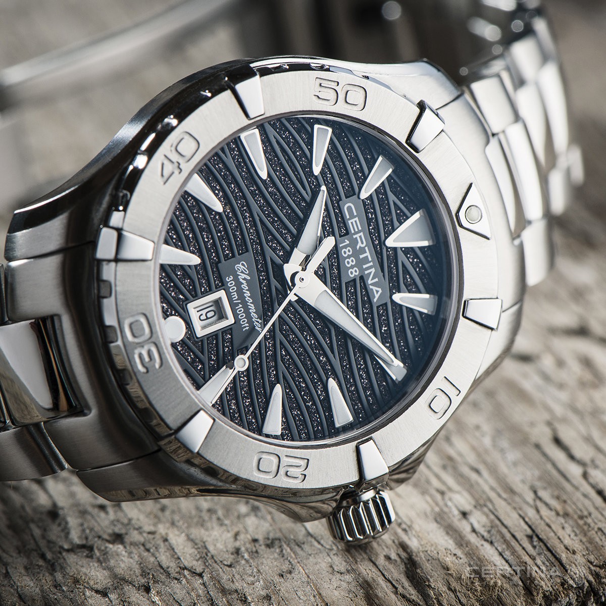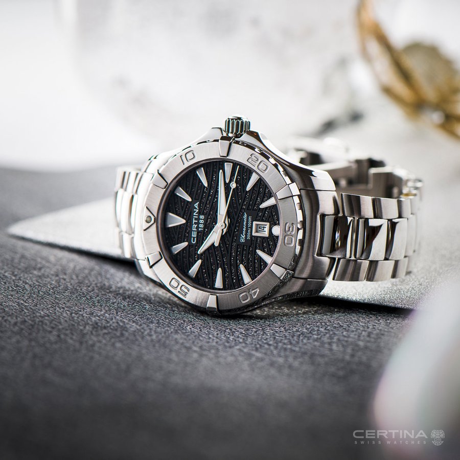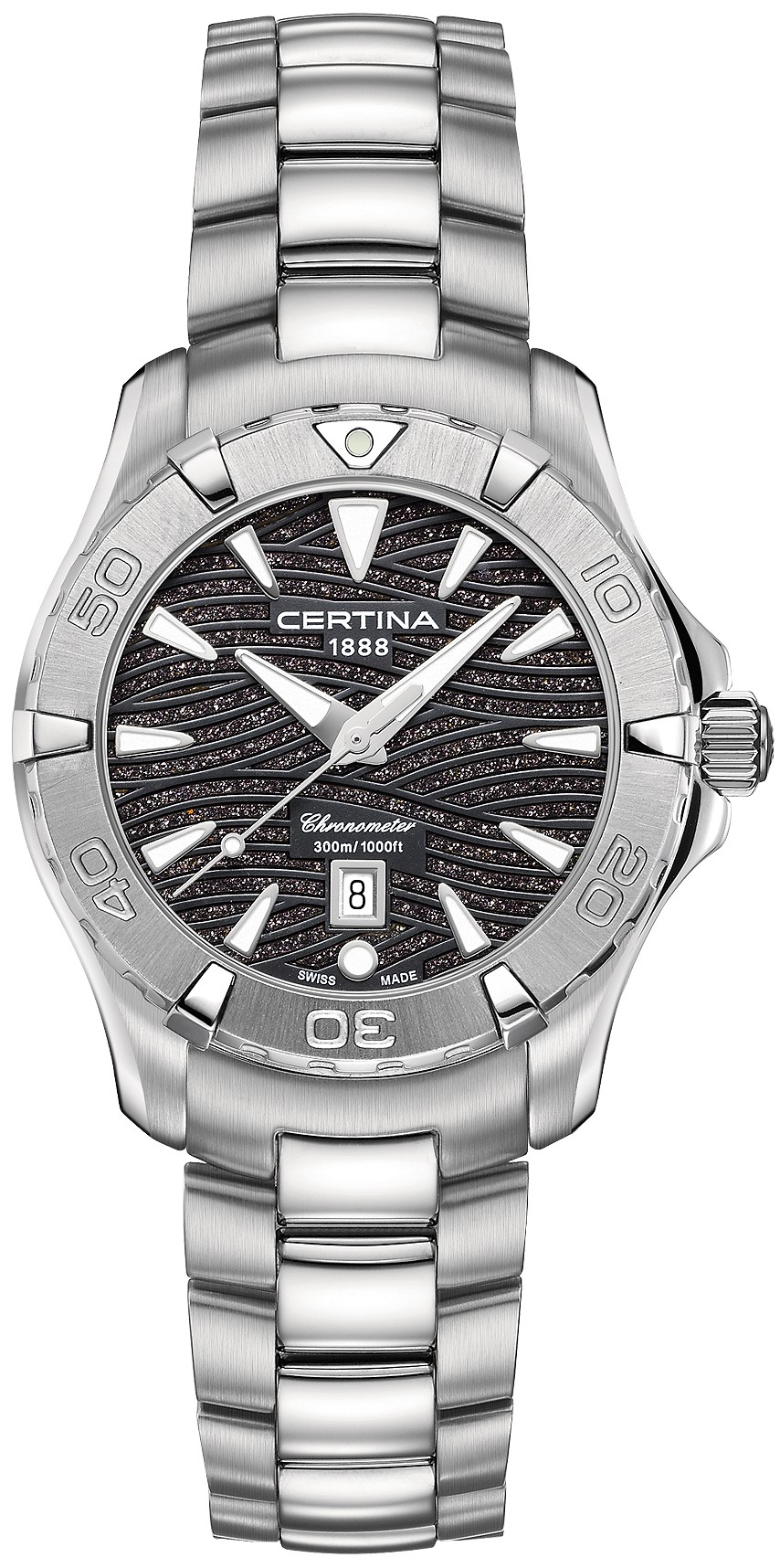Certina DS Action Lady Chronometer C032.251.11.051.09 to damski zegarek na baterię na metalowej bransolecie ze składanym zapięciem. Koperta ze szczotkowanej i polerowanej stali nierdzewnej ma średnicę 34,3 milimetra, zakręcaną koronkę oraz jednokierunkowo obracający się bezel z polerowanymi lub satynowanymi elementami i skalą nurkową. Dekiel oznaczony logo żółwia symbolizuje solidność i trwałość zegarków Certina. Czarną tarczę z motywem połyskującej fali i datownikiem chroni trwałe szkło szafirowe z powłoką antyrefleksyjną. Zastosowane indeksy godzinowe wraz ze wskazówkami pokryte są powłoką luminescencyjną Super-LumiNova®, która gwarantuje doskonałą czytelność w warunkach słabego oświetlenia. Zegarek napędza niezawodny mechanizm kwarcowy ETA F04.411 z technologią Precidrive z dokładnością +/- 10 sekund na rok i sygnalizacją niskiego poziomu baterii. Zegarki posiadające certyfikat COSC, będący gwarancją dużej dokładności, noszą oznaczenie „Chronometr”. W modelu zastosowano technologię DS (Double Security), stosowaną i doskonaloną od 1959 roku, dzięki której zegarek ma zwiększoną odporność na uderzenia i wodę. Wodoodporność zegarka wynosi 30 ATM, co czyni go odpowiednim wyborem do snorkelingu i głębokiego nurkowania.