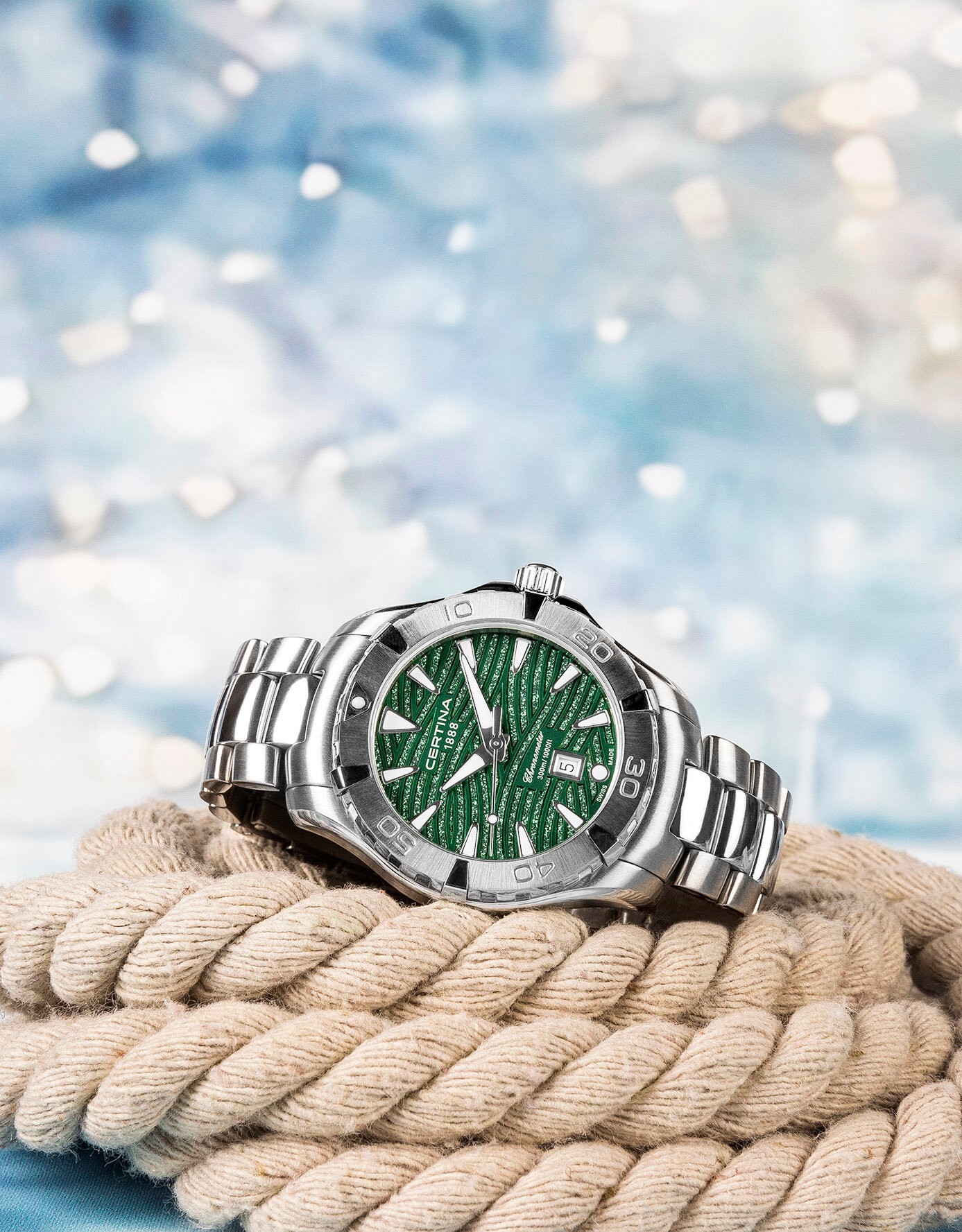 Certina DS Action Lady Chronometer C032.251.11.091.09 to damski zegarek na baterię na metalowej bransolecie ze składanym zapięciem. Koperta ze szczotkowanej i polerowanej stali nierdzewnej ma średnicę 34,3 milimetra, zakręcaną koronkę oraz jednokierunkowo obracający się bezel z polerowanymi lub satynowanymi elementami i skalą nurkową. Dekiel oznaczony logo żółwia symbolizuje solidność i trwałość zegarków Certina. Zielona tarcza z motywem połyskującej fali i datownikiem jest chroniona wytrzymałym szkłem szafirowym z powłoką antyrefleksyjną. Zastosowane indeksy godzinowe wraz ze wskazówkami pokryte są powłoką luminescencyjną Super-LumiNova®, która gwarantuje doskonałą czytelność w warunkach słabego oświetlenia. Zegarek napędza niezawodny mechanizm kwarcowy ETA F04.412 z technologią Precidrive z dokładnością +/- 10 sekund na rok i sygnalizacją niskiego poziomu baterii. Zegarki posiadające certyfikat COSC, będący gwarancją dużej dokładności, noszą oznaczenie „Chronometr”. W modelu zastosowano technologię DS (Double Security), stosowaną i doskonaloną od 1959 roku, dzięki której zegarek ma zwiększoną odporność na uderzenia i wodę. Wodoodporność zegarka wynosi 30 ATM, co czyni go odpowiednim wyborem do snorkelingu i głębokiego nurkowania.