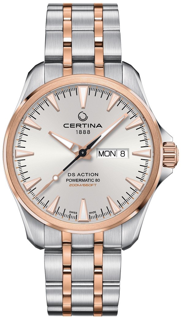 Certina DS Action Powermatic 80 C032.430.22.031.00 to męski zegarek automatyczny na metalowej dwukolorowej bransolecie z zapięciem motylkowym. Koperta wykonana ze stali nierdzewnej w kombinacji szlifowania i polerowania ma średnicę 41 milimetrów, przezroczystą obudowę oraz zewnętrzną bezel i koronkę z obróbką PVD w kolorze różowego złota. Srebrną tarczę ze szlifem słonecznym, oznaczeniem daty i dnia tygodnia chroni trwałe szkło szafirowe z powłoką antyrefleksyjną. Zastosowane indeksy godzinowe wraz ze wskazówkami pokryte są powłoką luminescencyjną Super-LumiNova®, która gwarantuje doskonałą czytelność w warunkach słabego oświetlenia. Zegarek napędzany jest mechanizmem Powermatic 80.621 z naciągiem automatycznym i rezerwą chodu wynoszącą około 80 godzin. Ten mechanizm z funkcją hakowania można w razie potrzeby nakręcić również ręcznie za pomocą sygnowanej koronki. W modelu zastosowano technologię DS (Double Security), stosowaną i doskonaloną od 1959 roku, dzięki której zegarek ma zwiększoną odporność na uderzenia i wodę. Wodoodporność zegarka wynosi 20 ATM, co czyni go odpowiednim wyborem do snorkelingu i nurkowania.