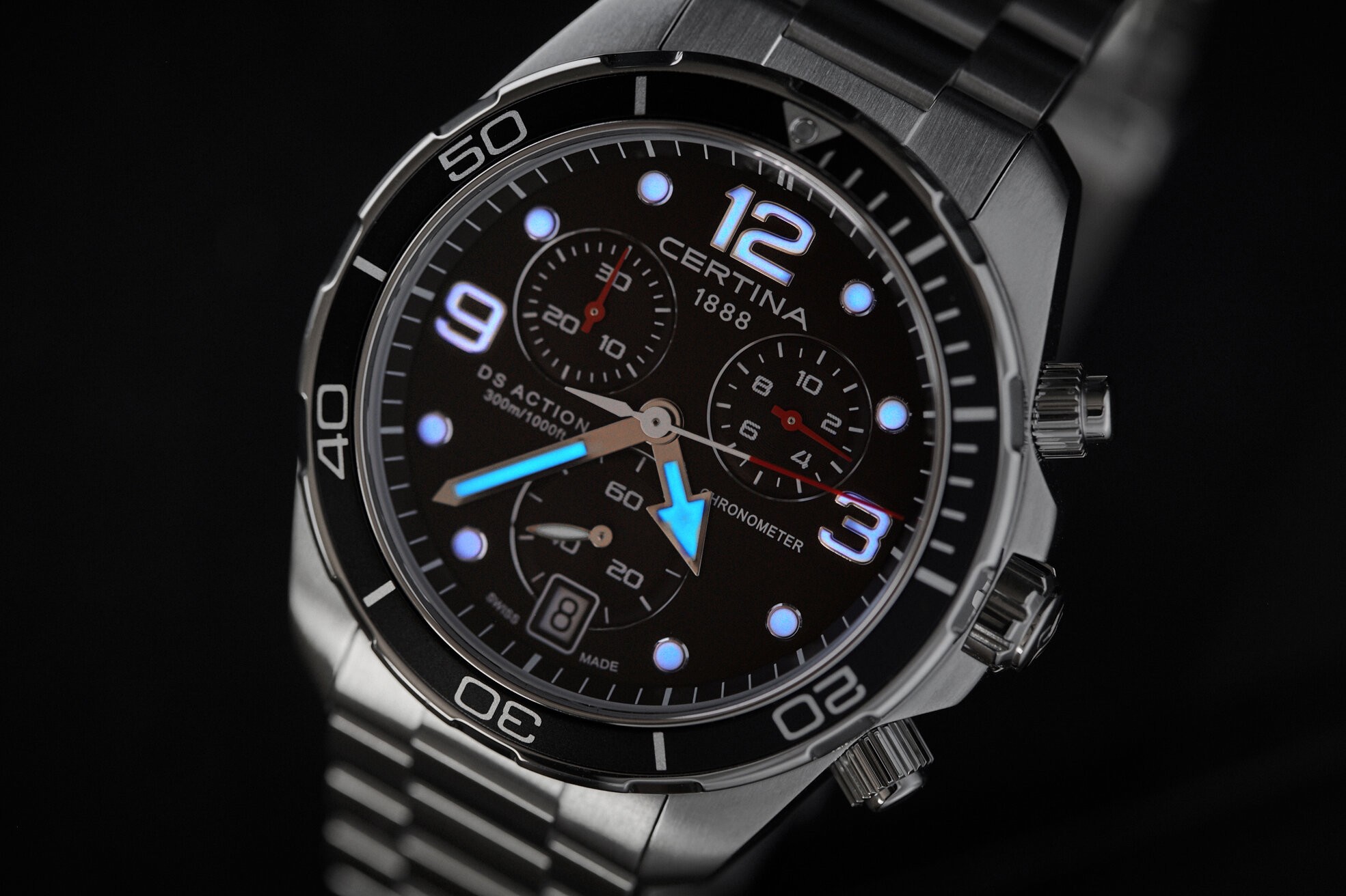 Certina DS Action Diver Chronometr C032.434.11.057.00 to męski zegarek na baterię na stalowej bransolecie ze składanym zapięciem. Koperta ze szczotkowanej i polerowanej stali nierdzewnej ma średnicę 43 milimetrów, zakręcaną koronkę, jednokierunkowo obracający się bezel z aluminiową wstawką ze skalą do nurkowania oraz dekiel oznaczony logo w kształcie żółwia, co reprezentuje solidność i długowieczność zegarków Certina. Czarną tarczę ze wskazaniem daty i funkcją chronografu chroni trwałe szkło szafirowe z powłoką antyrefleksyjną. Zastosowane indeksy godzinowe oraz wskazówki pokryte są powłoką luminescencyjną Super-LumiNova®, która gwarantuje doskonałą czytelność w warunkach słabego oświetlenia. Zegarek napędza niezawodny mechanizm kwarcowy ETA G10.212 z technologią Precidrive z dokładnością +/- 10 sekund na rok i sygnalizacją niskiego poziomu baterii. Zegarki posiadające certyfikat COSC, będący gwarancją dużej dokładności, noszą oznaczenie „Chronometr”. W modelu zastosowano technologię DS (Double Security), stosowaną i doskonaloną od 1959 roku, dzięki której zegarek ma zwiększoną odporność na uderzenia i wodę. Wodoodporność zegarka wynosi 30 ATM, co czyni go odpowiednim wyborem do snorkelingu i głębokiego nurkowania.