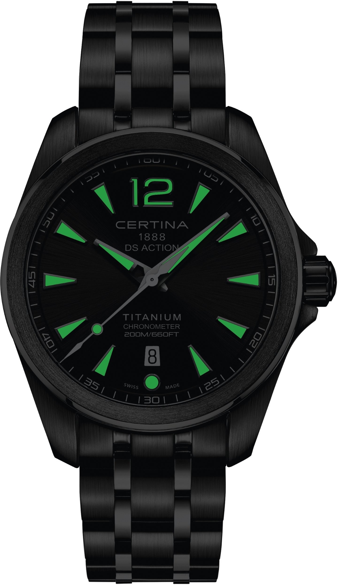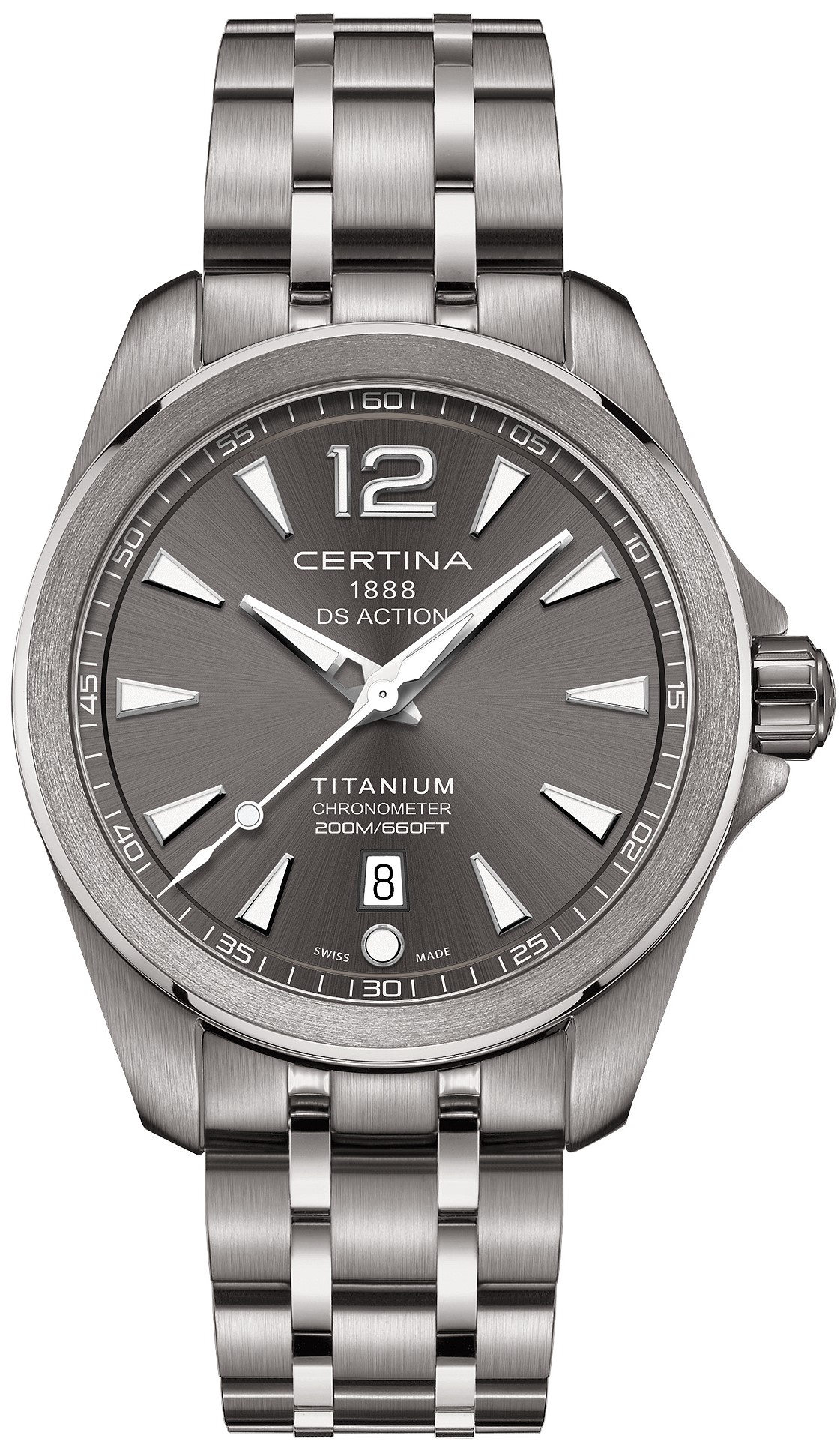 Certina DS Action C032.851.44.087.00 to męski zegarek na baterię na tytanowej bransolecie z zapięciem motylkowym. Koperta wykonana z tytanu w połączeniu szlifowania i polerowania ma średnicę 41 milimetrów, zakręcaną koronkę i dekiel oznaczony logo w kształcie żółwia, co reprezentuje solidność i długowieczność zegarków Certina. Szara tarcza ze szlifem słonecznym i datownikiem jest chroniona wytrzymałym szkłem szafirowym z powłoką antyrefleksyjną. Zastosowane indeksy godzinowe oraz wskazówki pokryte są powłoką luminescencyjną Super-LumiNova®, która gwarantuje doskonałą czytelność w warunkach słabego oświetlenia. Zegarek napędza niezawodny mechanizm kwarcowy ETA F06.411 z technologią Precidrive z dokładnością +/- 10 sekund na rok i sygnalizacją niskiego poziomu baterii. Zegarki posiadające certyfikat COSC, będący gwarancją dużej dokładności, noszą oznaczenie „Chronometr”. W modelu zastosowano technologię DS (Double Security), stosowaną i doskonaloną od 1959 roku, dzięki której zegarek ma zwiększoną odporność na uderzenia i wodę. Wodoodporność zegarka wynosi 20 ATM, co czyni go odpowiednim wyborem do snorkelingu i nurkowania.