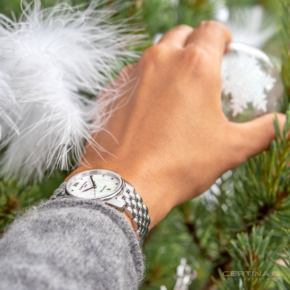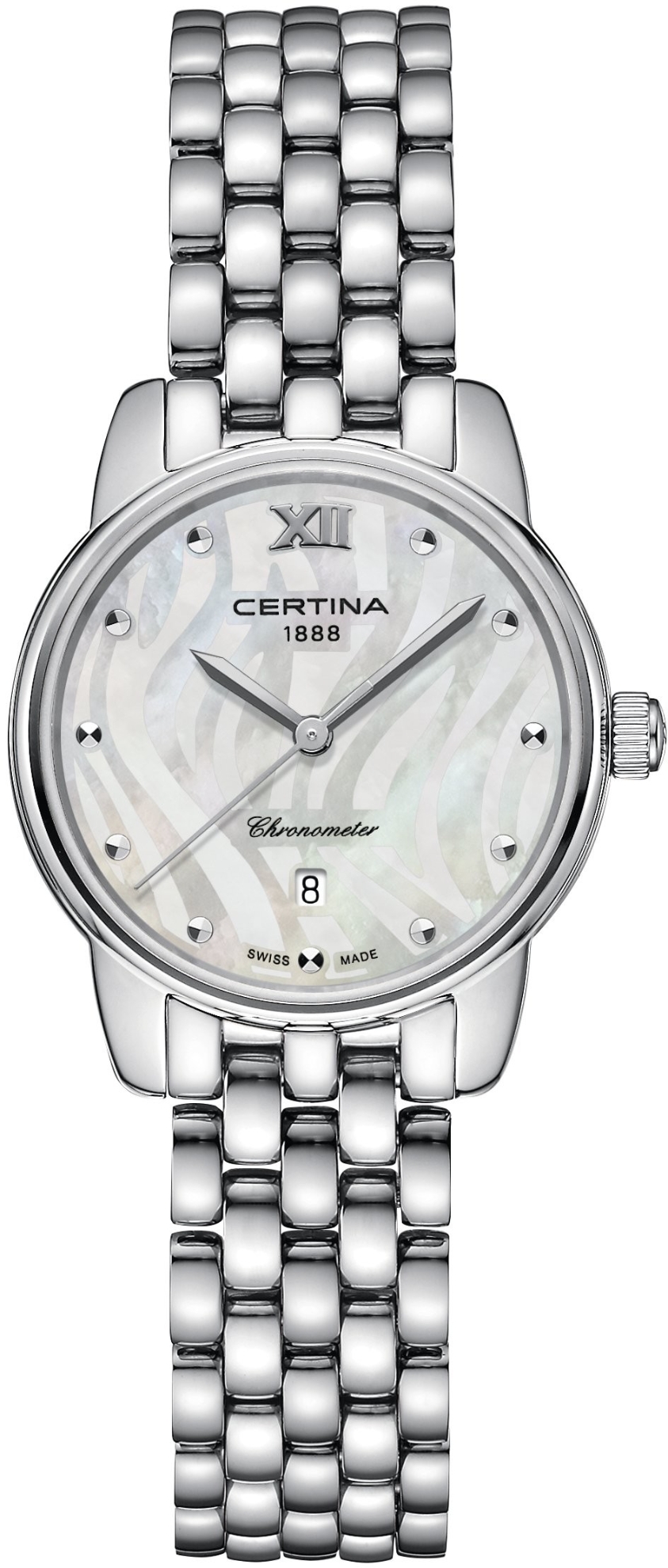 Certina DS-8 Lady C033.051.11.118.00 to damski zegarek na baterię na metalowej bransolecie z zapięciem motylkowym. Koperta ze stali nierdzewnej ma średnicę 27,5 milimetra i dekiel oznaczony logo żółwia, które reprezentuje solidność i trwałość zegarków Certina. Tarcza z masy perłowej z eleganckim wzorem i datownikiem chroniona jest wytrzymałym szkłem szafirowym z warstwą antyrefleksyjną, a jej piękno szczególnie podkreśla się pod bezpośrednim światłem, kiedy możemy obserwować grę kolory masy perłowej. Zegarek napędzany jest mechanizmem kwarcowym ETA F03.411 z technologią Precidrive z dokładnością +/- 10 sekund na rok i sygnalizacją niskiego poziomu baterii. Zegarki posiadające certyfikat COSC, będący gwarancją dużej dokładności, noszą oznaczenie „Chronometr”. W modelu zastosowano technologię DS(Double Security), stosowaną i doskonaloną od 1959 roku, dzięki której zegarek ma zwiększoną odporność na uderzenia i wodę. Wodoodporność zegarka wynosi 10 ATM i dlatego nadaje się do pływania i snorkelingu.