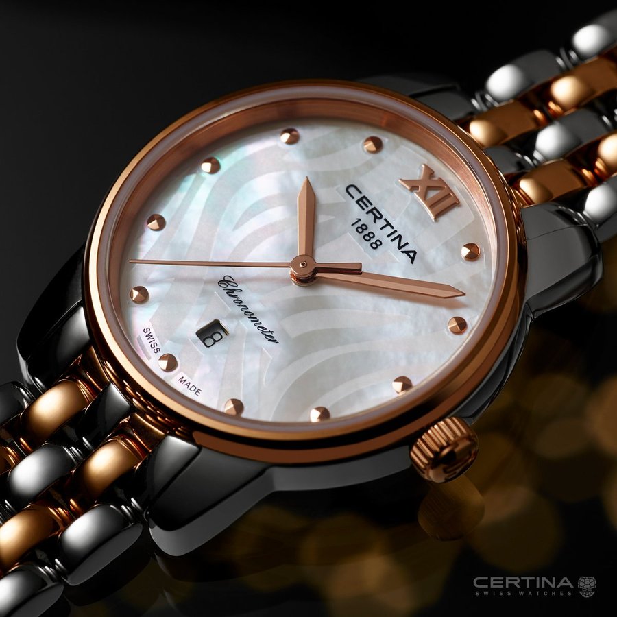 Certina DS-8 Lady C033.051.22.118.00 to damski zegarek na baterię na metalowej dwukolorowej bransolecie z zapięciem motylkowym. Koperta ze stali nierdzewnej ma średnicę 27,5 milimetra, zewnętrzną bezel z koronką pokrytą różowym złotem PVD i dekiel oznaczony logo żółwia, które reprezentuje solidność i trwałość zegarków Certina. Tarcza z masy perłowej z eleganckim wzorem i datownikiem chroniona jest wytrzymałym szkłem szafirowym z warstwą antyrefleksyjną, a jej piękno szczególnie podkreśla się pod bezpośrednim światłem, kiedy możemy obserwować grę kolory masy perłowej. Zegarek napędzany jest mechanizmem kwarcowym ETA F03.411 z technologią Precidrive z dokładnością +/- 10 sekund na rok i sygnalizacją niskiego poziomu baterii. Zegarki posiadające certyfikat COSC, będący gwarancją dużej dokładności, noszą oznaczenie „Chronometr”. W modelu zastosowano technologię DS(Double Security), stosowaną i doskonaloną od 1959 roku, dzięki której zegarek ma zwiększoną odporność na uderzenia i wodę. Wodoodporność zegarka wynosi 10 ATM i dlatego nadaje się do pływania i snorkelingu.