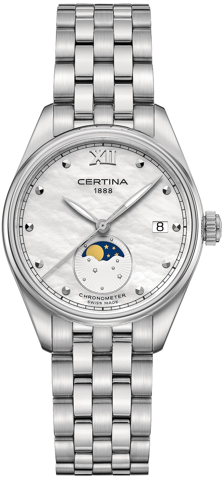 Certina DS-8 Lady C033.257.11.118.00 to damski zegarek na baterię na metalowej bransolecie w połączeniu kroju i połysku z zapięciem motylkowym. Koperta ze stali nierdzewnej ma średnicę 32 milimetrów i dekiel oznaczony logo żółwia, które reprezentuje solidność i trwałość zegarków Certina. Tarcza z masy perłowej ze wskaźnikiem faz księżyca i datownikiem chroniona jest wytrzymałym szkłem szafirowym z warstwą antyrefleksyjną, a jej piękno podkreśla się szczególnie w bezpośrednim świetle, kiedy można podziwiać grę kolorów masy perłowej. Zastosowane indeksy godzinowe uzupełniają wskazówki pokryte powłoką luminescencyjną Super-LumiNova®, która gwarantuje doskonałą czytelność w warunkach słabego oświetlenia. Zegarek napędzany jest mechanizmem kwarcowym ETA F05.441 z technologią Precidrive z dokładnością +/- 10 sekund na rok i sygnalizacją niskiego poziomu baterii. Zegarki posiadające certyfikat COSC, będący gwarancją dużej dokładności, noszą oznaczenie „Chronometr”. W modelu zastosowano technologię DS (Double Security), stosowaną i doskonaloną od 1959 roku, dzięki której zegarek ma zwiększoną odporność na uderzenia i wodę. Wodoodporność zegarka wynosi 10 ATM i dlatego nadaje się do pływania i snorkelingu.