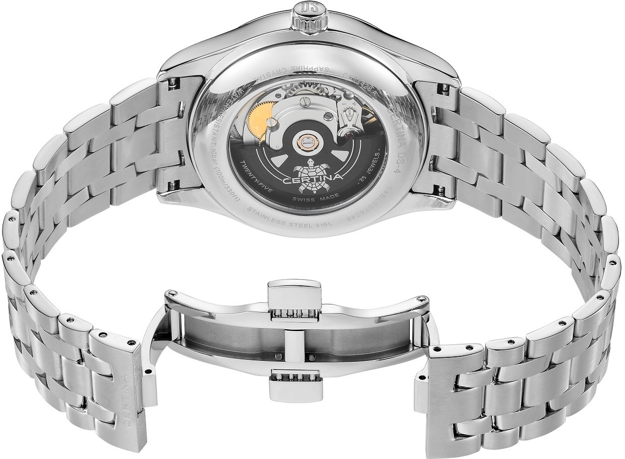 Certina DS-8 C033.428.11.031.00 to męski zegarek automatyczny na metalowej bransolecie w połączeniu szlifu i połysku z zapięciem motylkowym. Koperta ze stali nierdzewnej ma średnicę 40 milimetrów i przezroczysty dekiel. Srebrna tarcza o promienistej fakturze, ze wskazaniem daty i wskazówką sekundową na godzinie szóstej, jest chroniona wytrzymałym szkłem szafirowym. Zastosowane indeksy godzinowe oraz wskazówki pokryte są powłoką luminescencyjnąSuper-LumiNova®, która gwarantuje doskonałą czytelność w warunkach słabego oświetlenia. Zegarek napędzany jest mechanizmem mechanicznym ETA 2825-2 z naciągiem automatycznym i rezerwą chodu wynoszącą około 42 godziny. Ten mechanizm z funkcją hakowania można w razie potrzeby nakręcić również ręcznie za pomocą sygnowanej koronki. W modelu zastosowano technologię DS (Double Security), stosowaną i doskonaloną od 1959 roku, dzięki której zegarek ma zwiększoną odporność na uderzenia i wodę. Wodoodporność zegarka wynosi 10 ATM i dlatego nadaje się do pływania i snorkelingu.