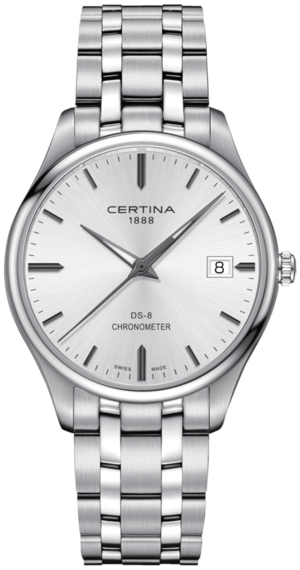Kolekcja DS-8 to uniwersalna i niedroga oferta zegarków marki Certina. Oferuje modele w kilku stylach z kopertami ze stali nierdzewnej, powłoką PVD i tytanem, które nadają się do noszenia na co dzień i do noszenia w towarzystwie. W modelach serii DS-8 zastosowano precyzyjne szwajcarskie mechanizmy kwarcowe lub mechanizmy ETA Powermatic 80, które oferują rezerwę chodu na poziomie 80 godzin. Wszystkie mają 100 metrów wodoodporność i oczywiście szafirowe szkło.