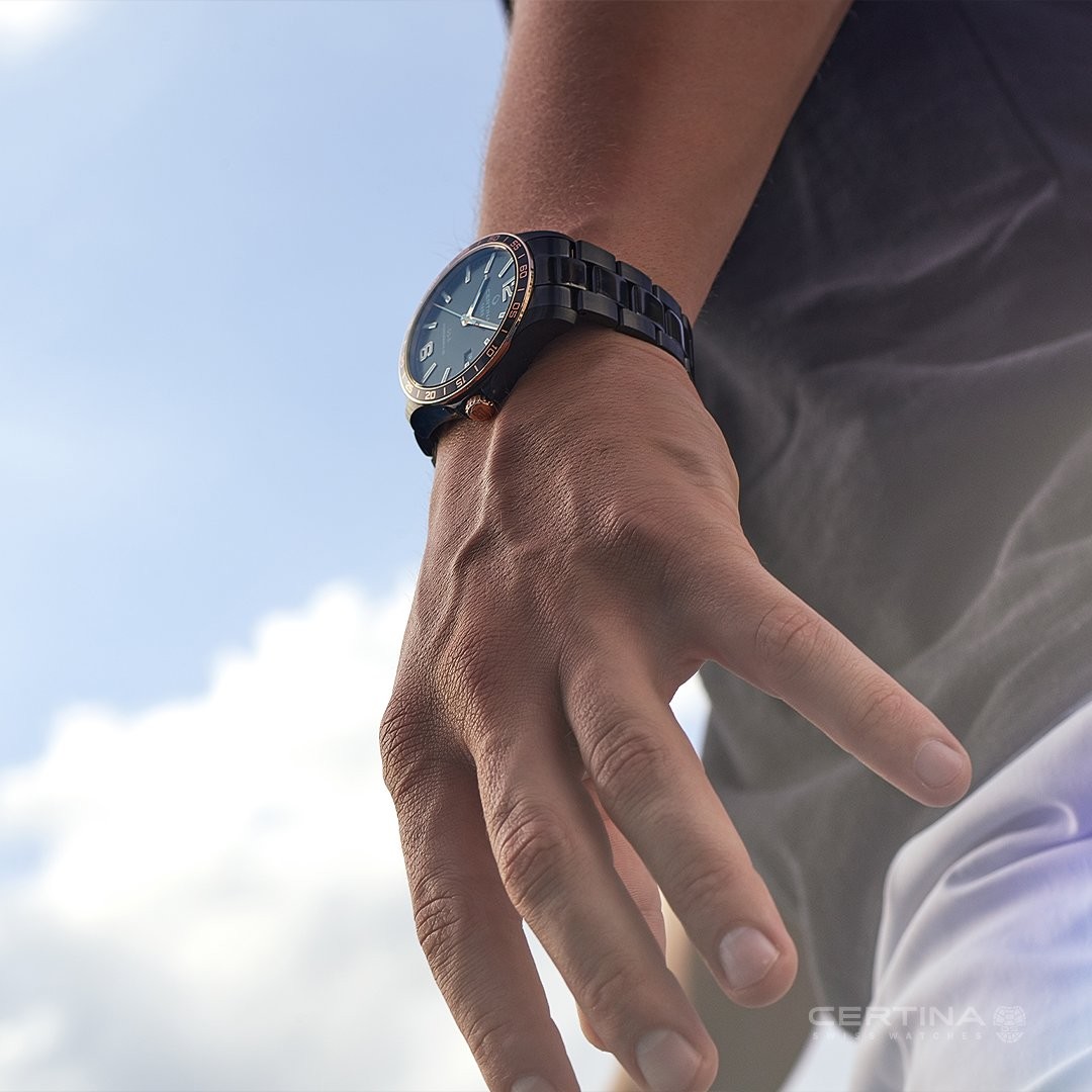 Certina DS-8 C033.807.33.057.00 to męski zegarek automatyczny na metalowej bransolecie z wykończeniem PVD w kolorze czarnym i zapięciem motylkowym. Stalowa koperta w tym samym kolorze ma średnicę 40,5 milimetra, przezroczysty dekiel i solidną bezel w kolorze różowego złota z czarną aluminiową wstawką ze skalą minutową. Czarną tarczę ze wskazaniem daty chroni trwałe szkło szafirowe z powłoką antyrefleksyjną. Zastosowane indeksy godzinowe wraz ze wskazówkami wykonane są w kolorze różowego złota i pokryte powłoką luminescencyjną Super-LumiNova®, która gwarantuje doskonałą czytelność w warunkach słabego oświetlenia. Zegarek napędzany jest mechanizmem Powermatic 80.611 z naciągiem automatycznym i rezerwą chodu wynoszącą około 80 godzin. Powermatic jest wyposażony w koło zamachowe Nivachron™, specjalny materiał antymagnetyczny, dzięki któremu zegarek jest wysoce odporny na pola magnetyczne. Ten mechanizm z funkcją hakowania można w razie potrzeby nakręcić również ręcznie za pomocą sygnowanej koronki. W modelu zastosowano technologię DS (Double Security), stosowaną i doskonaloną od 1959 roku, dzięki której zegarek ma zwiększoną odporność na uderzenia i wodę. Wodoodporność zegarka wynosi 10 ATM i dlatego nadaje się do pływania i snorkelingu.