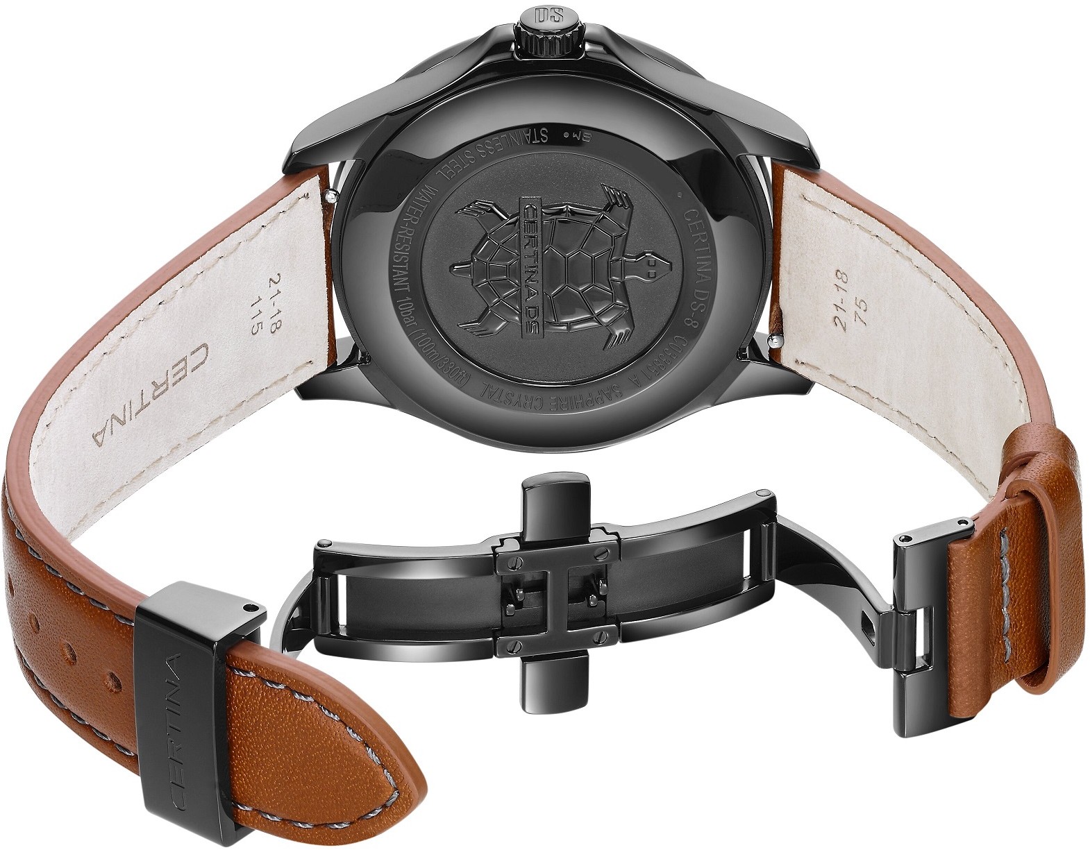 Certina DS-8 Quartz Precidrive Chronometer C033.851.36.057.00 to męski zegarek na baterie na brązowym skórzanym pasku z zapięciem motylkowym. Koperta ze stali nierdzewnej pokryta czarną powłoką PVD ma średnicę 41 milimetrów, stałą bezel z czarną aluminiową wstawką ze skalą minutową oraz dekiel oznaczony logo żółwia, które reprezentuje solidność i trwałość zegarków Certina. Czarną tarczę ze wskazaniem daty chroni trwałe szkło szafirowe z powłoką antyrefleksyjną. Zastosowane indeksy godzinowe wraz ze wskazówkami pokryte są powłoką luminescencyjną Super-LumiNova®, która gwarantuje doskonałą czytelność w warunkach słabego oświetlenia. Zegarek napędzany jest mechanizmem kwarcowym ETA F07.412 z technologią Precidrive z dokładnością +/- 10 sekund na rok i sygnalizacją niskiego poziomu baterii. Zegarki posiadające certyfikat COSC, będący gwarancją dużej dokładności, noszą oznaczenie „Chronometr”. W modelu zastosowano technologię DS (Double Security), stosowaną i doskonaloną od 1959 roku, dzięki której zegarek ma zwiększoną odporność na uderzenia i wodę. Wodoodporność zegarka wynosi 10 ATM i dlatego nadaje się do pływania i snorkelingu.