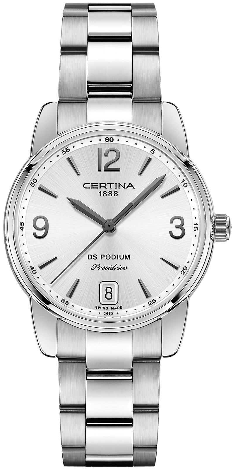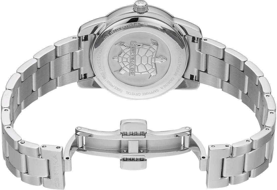 Certina DS Podium Lady C034.210.11.037.00 to damski zegarek na baterię na metalowej bransolecie w połączeniu szczotkowania i polerowania z zapięciem motylkowym. Koperta ze stali nierdzewnej ma średnicę 33 milimetrów i dekiel oznaczony logo żółwia, które reprezentuje solidność i trwałość zegarków Certina. Srebrną tarczę ze szlifem słonecznym i datownikiem chroni trwałe szkło szafirowe z powłoką antyrefleksyjną. Zegarek napędzany jest mechanizmem kwarcowym ETA F06.411 z technologią Precidrive z dokładnością +/- 10 sekund na rok i sygnalizacją niskiego poziomu baterii. W modelu zastosowano technologię DS(Double Security), stosowaną i doskonaloną od 1959 roku, dzięki której zegarek ma zwiększoną odporność na uderzenia i wodę. Wodoodporność zegarka wynosi 10 ATM i dlatego nadaje się do pływania i snorkelingu.