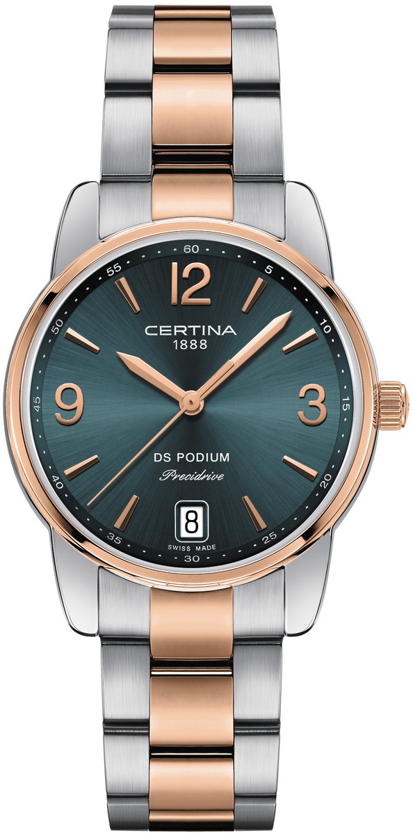 Certina DS Podium Lady C034.210.22.097.00 to damski zegarek na baterię na stalowej dwukolorowej bransolecie z częściową powłoką PVD w kolorze różowego złota i zapięciem motylkowym. Koperta ze stali nierdzewnej ma średnicę 33 milimetrów i dekiel oznaczony logo żółwia, które reprezentuje solidność i trwałość zegarków Certina. Ciemnozielona tarcza ze szlifem słonecznym i datownikiem jest chroniona wytrzymałym szkłem szafirowym z powłoką antyrefleksyjną. Zastosowane indeksy godzin i wskazówki w kolorze różowego złota pasują do ramki, koronki i mechanizmu zegarka. Zegarek napędzany jest mechanizmem kwarcowym ETA F06.411 z technologią Precidrive z dokładnością +/- 10 sekund na rok i sygnalizacją niskiego poziomu baterii. W modelu zastosowano technologię DS (Double Security), stosowaną i doskonaloną od 1959 roku, dzięki której zegarek ma zwiększoną odporność na uderzenia i wodę. Wodoodporność zegarka wynosi 10 ATM i dlatego nadaje się do pływania i snorkelingu.