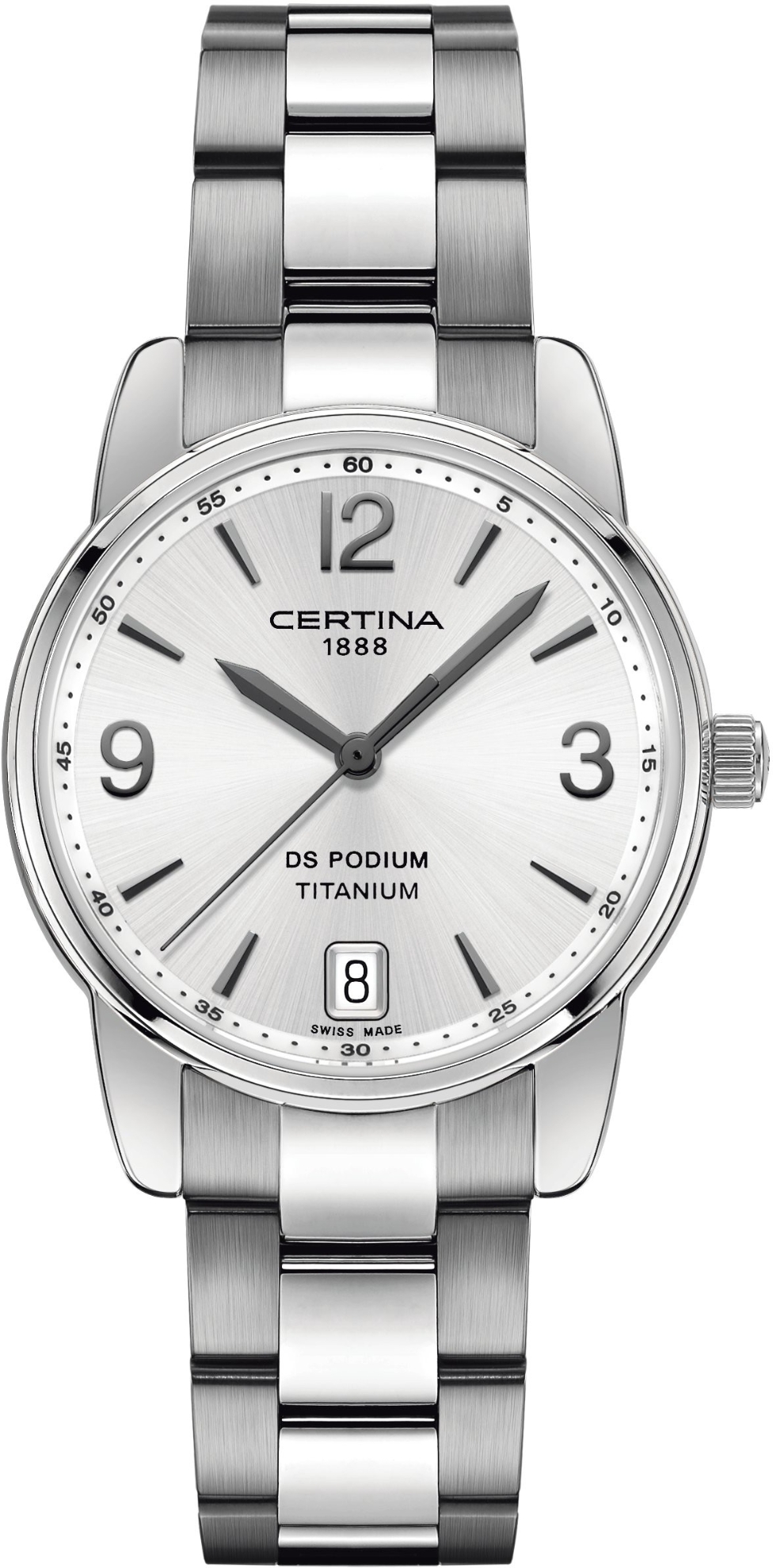 Certina DS Podium Lady C034.210.44.037.00 to damski zegarek na baterię na tytanowej bransolecie w połączeniu kroju i połysku z zapięciem motylkowym. Tytanowa koperta ma średnicę 33 milimetrów i dekiel oznaczony logo żółwia, które reprezentuje solidność i trwałość zegarków Certina. Srebrną tarczę ze szlifem słonecznym i datownikiem chroni trwałe szkło szafirowe z powłoką antyrefleksyjną. Zegarek napędzany jest mechanizmem kwarcowym ETA F06.411 z technologią Precidrive z dokładnością +/- 10 sekund na rok i sygnalizacją niskiego poziomu baterii. W modelu zastosowano technologię DS(Double Security), stosowaną i doskonaloną od 1959 roku, dzięki której zegarek ma zwiększoną odporność na uderzenia i wodę. Wodoodporność zegarka wynosi 10 ATM i dlatego nadaje się do pływania i snorkelingu.