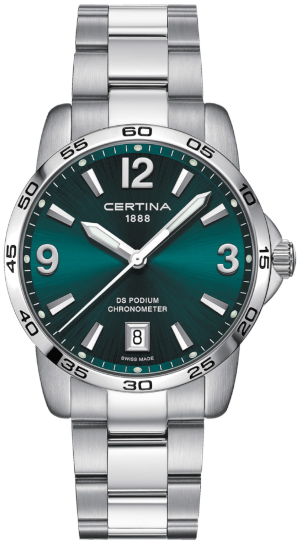Certina DS Podium C034.451.11.097.00 to męski zegarek na baterię na metalowej bransolecie w połączeniu kroju i połysku z zapięciem motylkowym. Stalowa koperta ze stałą ramką ze skalą minutową ma średnicę 40 milimetrów i dekiel oznaczony logo żółwia, które reprezentuje solidność i trwałość zegarków Certina. Ciemnozielona tarcza ze szlifem słonecznym i datownikiem jest chroniona wytrzymałym szkłem szafirowym z powłoką antyrefleksyjną. Zastosowane indeksy godzinowe oraz wskazówki pokryte są powłoką luminescencyjną Super-LumiNova®, która gwarantuje doskonałą czytelność w warunkach słabego oświetlenia. Zegarek napędzany jest mechanizmem kwarcowym ETA F07.412 z technologią Precidrive z dokładnością +/- 10 sekund na rok i sygnalizacją niskiego poziomu baterii. Zegarki posiadające certyfikat COSC, będący gwarancją dużej dokładności, noszą oznaczenie „Chronometr”. W modelu zastosowano technologię DS(Double Security), stosowaną i doskonaloną od 1959 roku, dzięki której zegarek ma zwiększoną odporność na uderzenia i wodę. Wodoodporność zegarka wynosi 10 ATM i dlatego nadaje się do pływania i snorkelingu.