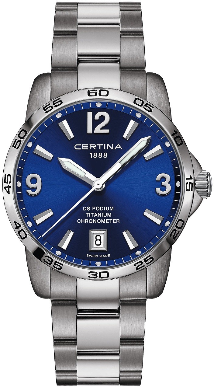 Certina DS Podium C034.451.44.047.00 to męski zegarek na baterię na tytanowej bransolecie w połączeniu kroju i połysku z zapięciem motylkowym. Tytanowa koperta ze stałą ramką i skalą minutową ma średnicę 40 milimetrów i dekiel oznaczony logo żółwia, które reprezentuje solidność i trwałość zegarków Certina. Ciemnoniebieska tarcza ze szlifem słonecznym i wskazaniem daty jest chroniona wytrzymałym szkłem szafirowym z powłoką antyrefleksyjną. Zastosowane indeksy godzinowe wraz ze wskazówkami pokryte są powłoką luminescencyjną Super-LumiNova®, która gwarantuje doskonałą czytelność w warunkach słabego oświetlenia. Zegarek napędzany jest mechanizmem kwarcowym ETA F07.412 z technologią Precidrive z dokładnością +/- 10 sekund na rok i sygnalizacją niskiego poziomu baterii. Zegarki posiadające certyfikat COSC, będący gwarancją dużej dokładności, noszą oznaczenie „Chronometr”. W modelu zastosowano technologię DS(Double Security), stosowaną i doskonaloną od 1959 roku, dzięki której zegarek ma zwiększoną odporność na uderzenia i wodę. Wodoodporność zegarka wynosi 10 ATM i dlatego nadaje się do pływania i snorkelingu.