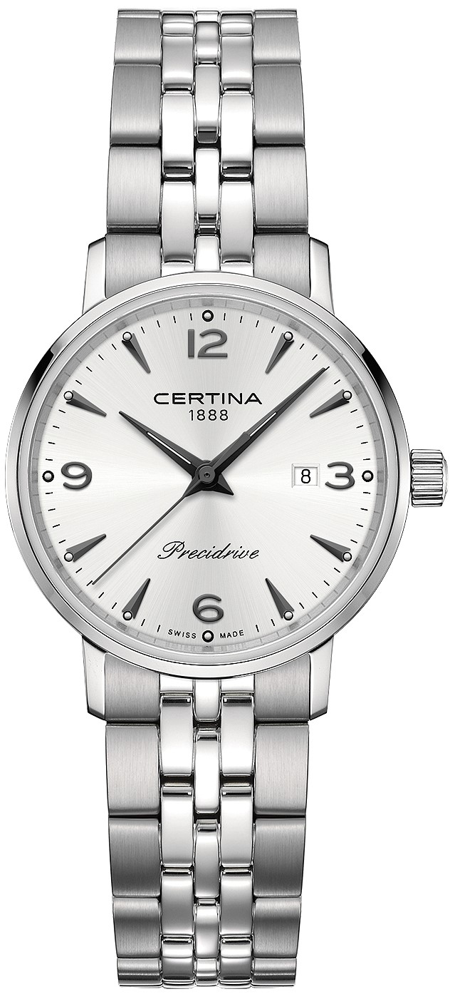 Certina DS Caimano Lady C035.210.11.037.00 to damski zegarek na baterię na stalowej bransolecie w połączeniu szczotkowania i polerowania z zapięciem motylkowym. Koperta ze stali nierdzewnej ma średnicę 28 milimetrów i dekiel oznaczony logo żółwia, które reprezentuje solidność i trwałość zegarków Certina. Srebrną tarczę ze szlifem słonecznym i datownikiem chroni trwałe szkło szafirowe z powłoką antyrefleksyjną. Zastosowane indeksy godzinowe i wskazówki pokryte są powłoką luminescencyjną Super-LumiNova®, która gwarantuje doskonałą czytelność w warunkach słabego oświetlenia. Zegarek napędzany jest mechanizmem kwarcowym ETA F03.412 z technologią Precidrive z dokładnością +/- 10 sekund na rok i sygnalizacją niskiego poziomu baterii. W modelu zastosowano technologię DS (Double Security), stosowaną i doskonaloną od 1959 roku, dzięki której zegarek ma zwiększoną odporność na uderzenia i wodę. Wodoodporność zegarka wynosi 10 ATM i dlatego nadaje się do pływania i snorkelingu.