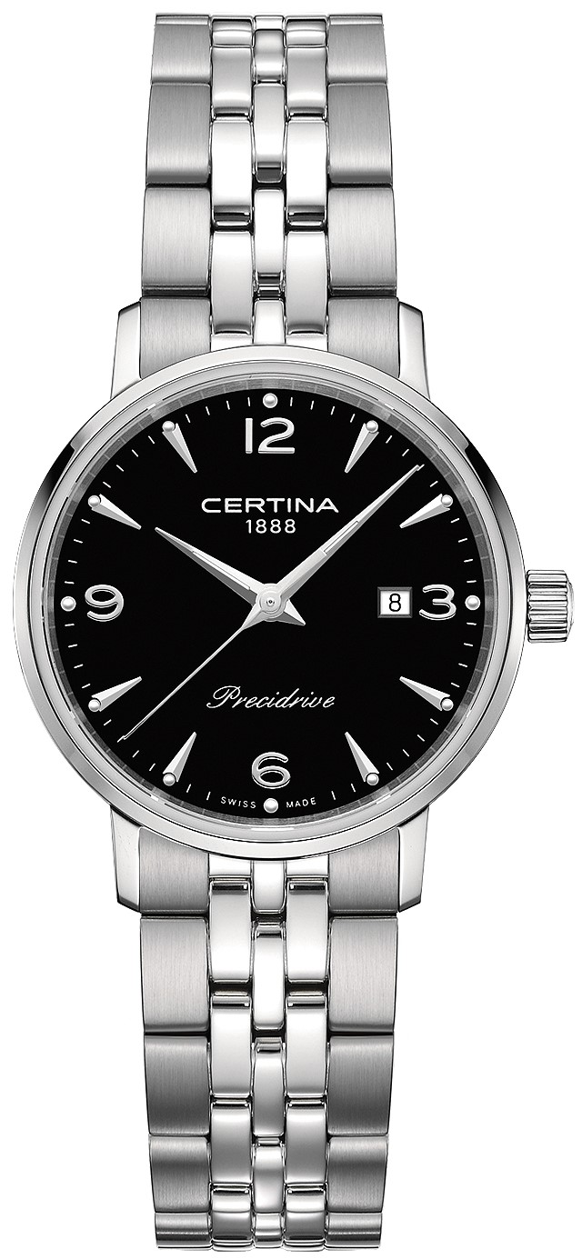 Certina DS Caimano Lady C035.210.11.057.00 to damski zegarek na baterię na stalowej bransolecie w połączeniu szczotkowania i polerowania z zapięciem motylkowym. Koperta ze stali nierdzewnej ma średnicę 28 milimetrów i dekiel oznaczony logo żółwia, które reprezentuje solidność i trwałość zegarków Certina. Czarną tarczę ze wskazaniem daty chroni trwałe szkło szafirowe z powłoką antyrefleksyjną. Zastosowane indeksy godzinowe i wskazówki pokryte są powłoką luminescencyjną Super-LumiNova®, która gwarantuje doskonałą czytelność w warunkach słabego oświetlenia. Zegarek napędzany jest mechanizmem kwarcowym ETA F03.411 z technologią Precidrive z dokładnością +/- 10 sekund na rok i sygnalizacją niskiego poziomu baterii. W modelu zastosowano technologię DS (Double Security), stosowaną i doskonaloną od 1959 roku, dzięki której zegarek ma zwiększoną odporność na uderzenia i wodę. Wodoodporność zegarka wynosi 10 ATM i dlatego nadaje się do pływania i snorkelingu.