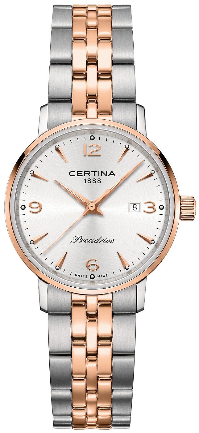Certina DS Caimano Lady C035.210.22.037.01 to damski zegarek na baterię na dwukolorowej stalowej bransolecie z częściową powłoką PVD w kolorze różowego złota i zapięciem motylkowym. Koperta ze stali nierdzewnej ma średnicę 28 milimetrów, zewnętrzna ramka i koronka są pokryte metodą PVD w kolorze różowego złota, a deklua jest oznaczona logo w kształcie żółwia, które reprezentuje solidność i trwałość zegarków Certina. Srebrną tarczę ze szlifem słonecznym i datownikiem chroni trwałe szkło szafirowe z powłoką antyrefleksyjną. Zastosowane indeksy godzinowe i wskazówki pokryte są powłoką luminescencyjną Super-LumiNova®, która gwarantuje doskonałą czytelność w warunkach słabego oświetlenia. Zegarek napędzany jest mechanizmem kwarcowym ETA F03.412 z technologią Precidrive z dokładnością +/- 10 sekund na rok i sygnalizacją niskiego poziomu baterii. W modelu zastosowano technologię DS (Double Security), stosowaną i doskonaloną od 1959 roku, dzięki której zegarek ma zwiększoną odporność na uderzenia i wodę. Wodoodporność zegarka wynosi 10 ATM i dlatego nadaje się do pływania i snorkelingu.