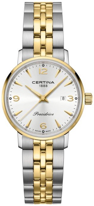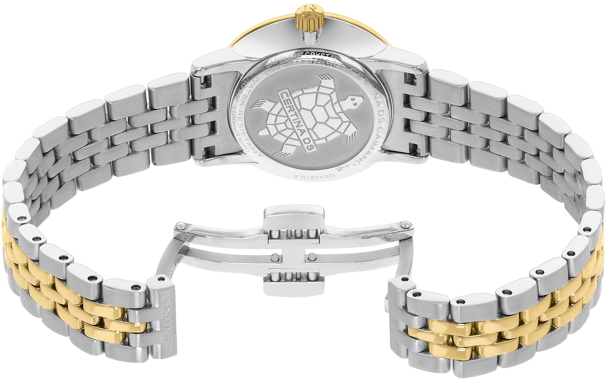 Certina DS Caimano Lady C035.210.22.037.02 to damski zegarek na baterię na dwukolorowej stalowej bransolecie z częściowo złoconą powłoką PVD i zapięciem motylkowym. Koperta ze stali nierdzewnej ma średnicę 28 milimetrów, zewnętrzna ramka i koronka są pokryte metodą PVD w kolorze złotym, a deklua jest oznaczona logo w kształcie żółwia, które reprezentuje solidność i trwałość zegarków Certina. Srebrną tarczę ze szlifem słonecznym i datownikiem chroni trwałe szkło szafirowe z powłoką antyrefleksyjną. Zastosowane indeksy godzinowe i wskazówki pokryte są powłoką luminescencyjną Super-LumiNova®, która gwarantuje doskonałą czytelność w warunkach słabego oświetlenia. Zegarek napędzany jest mechanizmem kwarcowym ETA F03.411 z technologią Precidrive z dokładnością +/- 10 sekund na rok i sygnalizacją niskiego poziomu baterii. W modelu zastosowano technologię DS (Double Security), stosowaną i doskonaloną od 1959 roku, dzięki której zegarek ma zwiększoną odporność na uderzenia i wodę. Wodoodporność zegarka wynosi 10 ATM i dlatego nadaje się do pływania i snorkelingu.