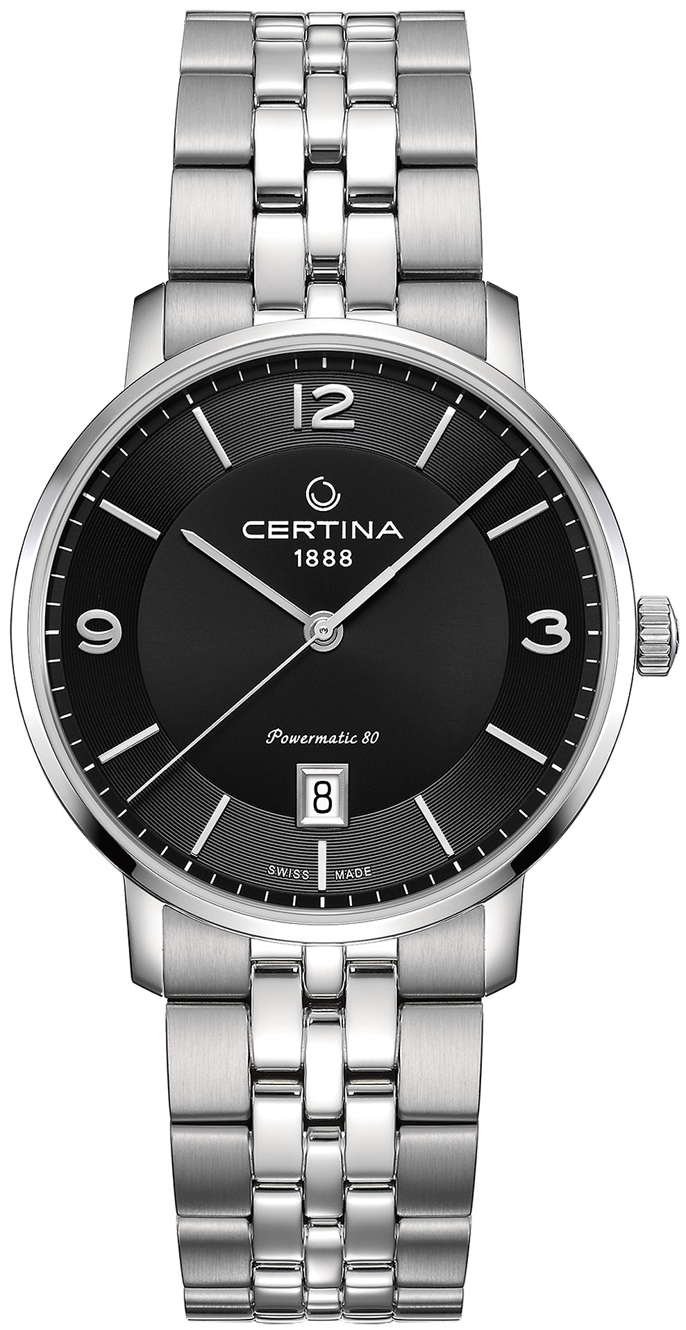 Certina DS Caimano Powermatic 80 C035.407.11.057.00 to męski zegarek automatyczny na stalowej bransolecie w połączeniu szlifu i połysku z zapięciem motylkowym. Ten uniwersalny klasyczny zegarek możesz nosić na każdą okazję, nadaje się do noszenia na co dzień. Koperta ze stali nierdzewnej ma średnicę 39 milimetrów i przezroczysty dekiel. Czarna tarcza z delikatną fakturą na obwodzie i wskazaniem daty są chronione trwałym szkłem szafirowym z powłoką antyrefleksyjną. Zegarek napędzany jest mechanizmem Powermatic 80.111 z naciągiem automatycznym i rezerwą chodu wynoszącą około 80 godzin. Ten mechanizm z funkcją hakowania można w razie potrzeby nakręcić również ręcznie za pomocą sygnowanej koronki. W modelu zastosowano technologię DS (Double Security), stosowaną i doskonaloną od 1959 roku, dzięki której zegarek ma zwiększoną odporność na uderzenia i wodę. Wodoodporność zegarka wynosi 10 ATM i dlatego nadaje się do pływania i snorkelingu.