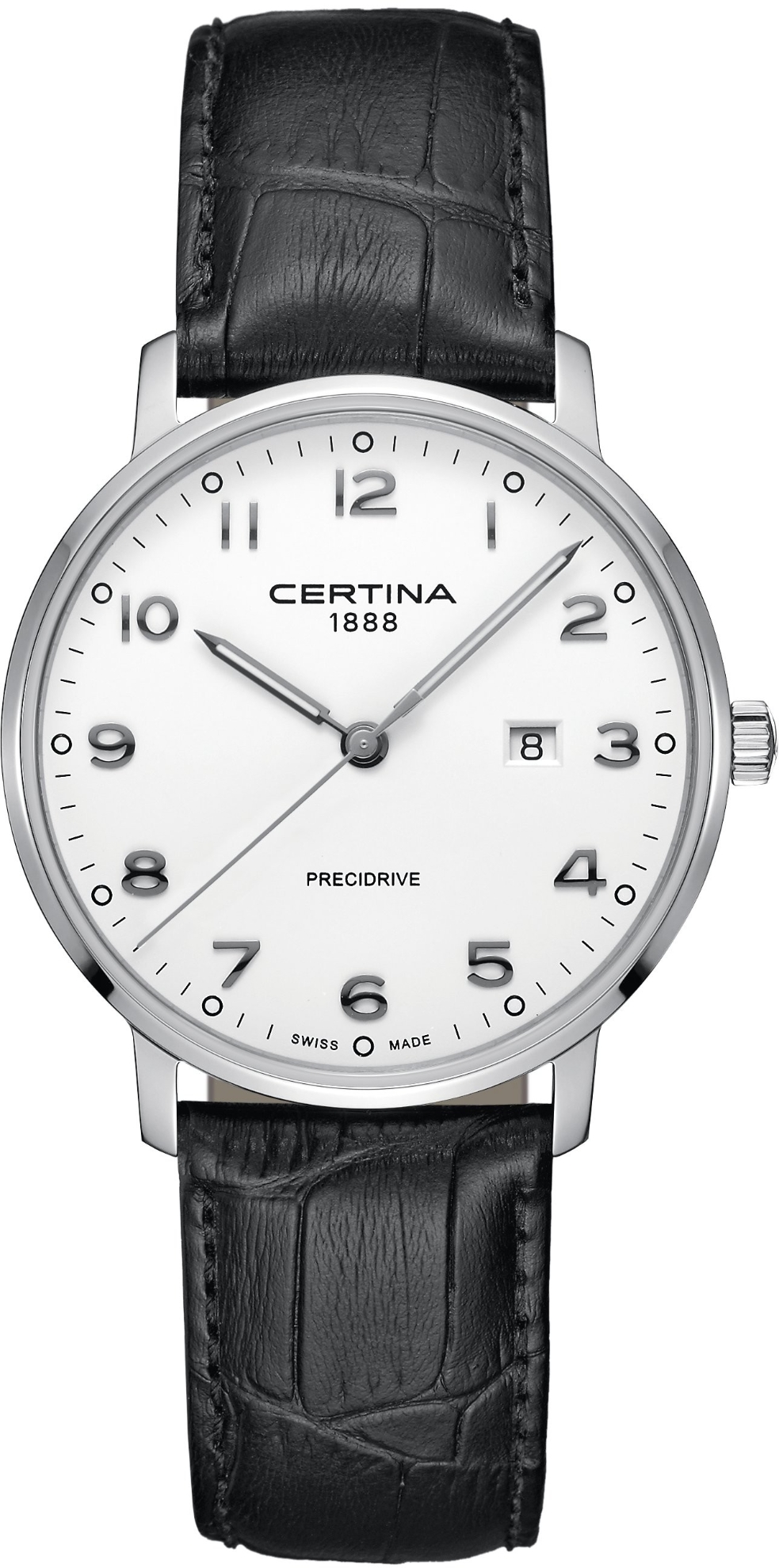 Certina DS Caimano C035.410.16.012.00 to męski zegarek na baterię na czarnym skórzanym pasku ze sprzączką. Koperta ze stali nierdzewnej ma średnicę 39 milimetrów i dekiel oznaczony logo żółwia, które reprezentuje solidność i trwałość zegarków Certina. Biała tarcza ze wskazaniem daty jest chroniona wytrzymałym szkłem szafirowym z powłoką antyrefleksyjną. Zastosowane indeksy godzinowe i wskazówki pokryte są powłoką luminescencyjną Super-LumiNova®, która gwarantuje doskonałą czytelność w warunkach słabego oświetlenia. Zegarek napędzany jest mechanizmem kwarcowym ETA F05.411 z technologią Precidrive z dokładnością +/- 10 sekund na rok i sygnalizacją niskiego poziomu baterii. W modelu zastosowano technologię DS (Double Security), stosowaną i doskonaloną od 1959 roku, dzięki której zegarek ma zwiększoną odporność na uderzenia i wodę. Wodoodporność zegarka wynosi 10 ATM i dlatego nadaje się do pływania i snorkelingu.