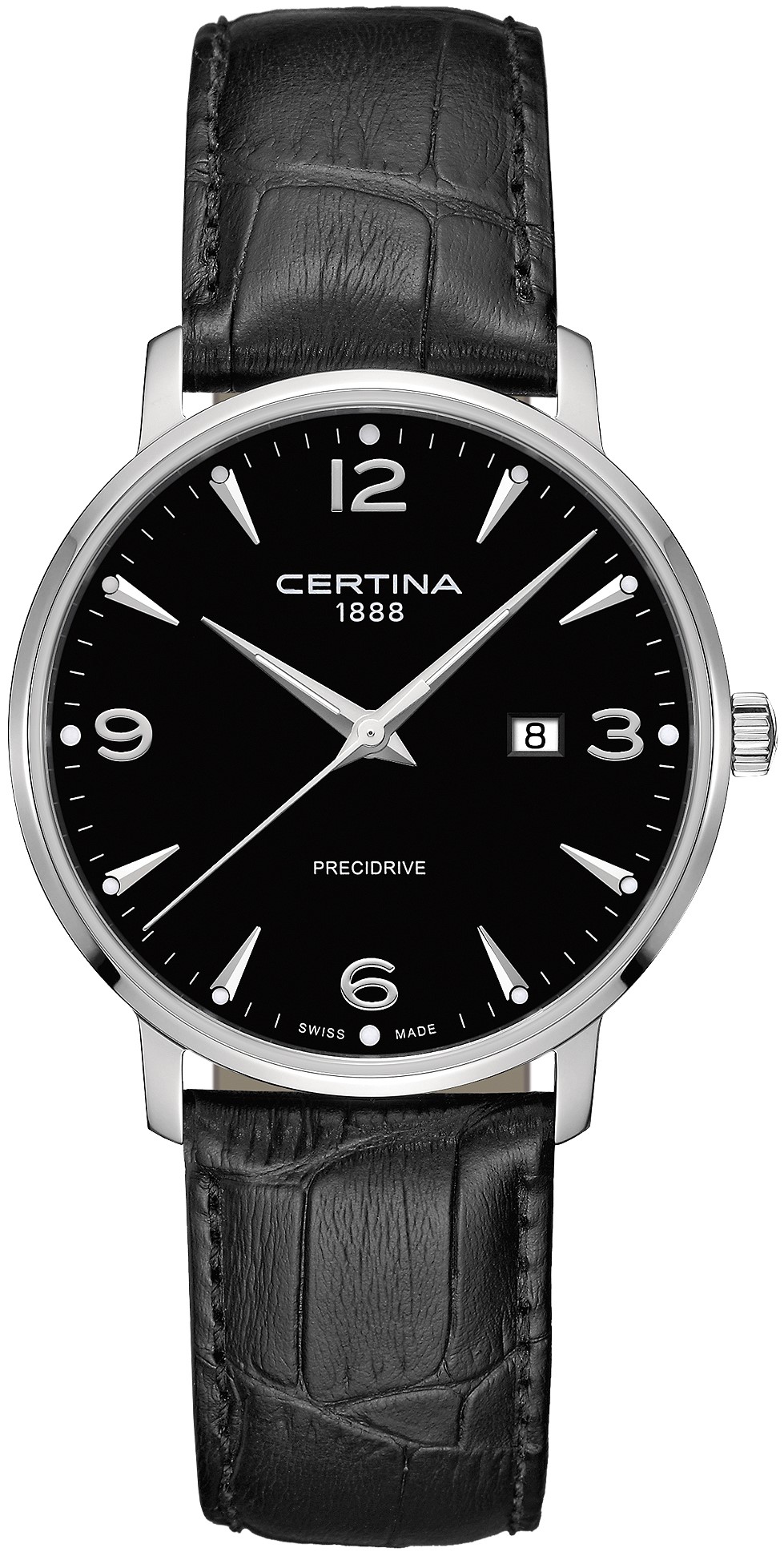 Certina DS Caimano C035.410.16.057.00 to męski zegarek na baterię na czarnym skórzanym pasku ze sprzączką. Koperta ze stali nierdzewnej ma średnicę 39 milimetrów i dekiel oznaczony logo żółwia, które reprezentuje solidność i trwałość zegarków Certina. Czarną tarczę ze wskazaniem daty chroni trwałe szkło szafirowe z powłoką antyrefleksyjną. Zastosowane indeksy godzinowe wraz ze wskazówkami pokryte są powłoką luminescencyjną Super-LumiNova®, która gwarantuje doskonałą czytelność w warunkach słabego oświetlenia. Zegarek napędzany jest mechanizmem kwarcowym ETA F05.411 z technologią Precidrive z dokładnością +/- 10 sekund na rok i sygnalizacją niskiego poziomu baterii. W modelu zastosowano technologię DS (Double Security), stosowaną i doskonaloną od 1959 roku, dzięki której zegarek ma zwiększoną odporność na uderzenia i wodę. Wodoodporność zegarka wynosi 10 ATM i dlatego nadaje się do pływania i snorkelingu.