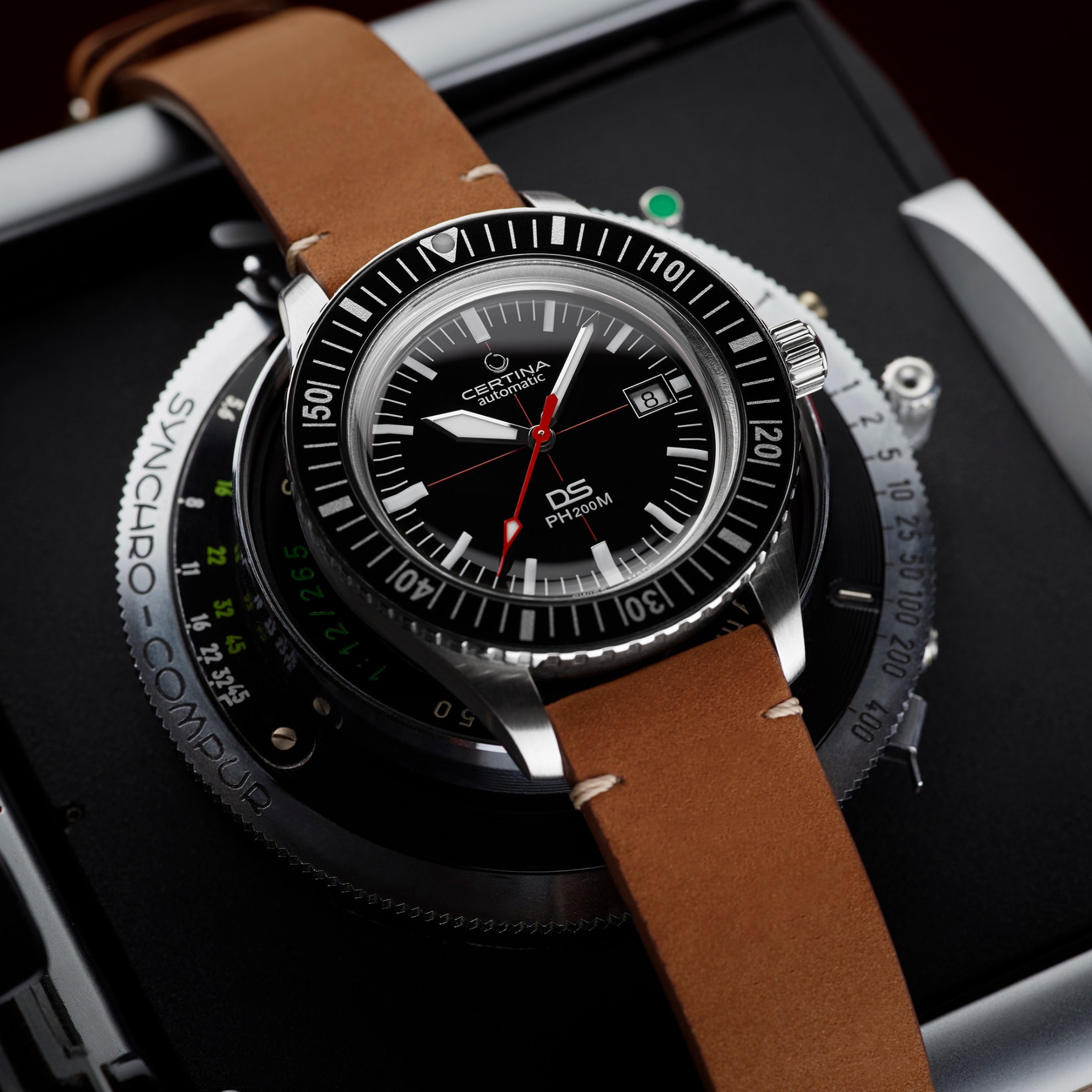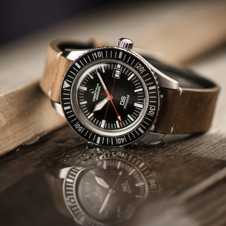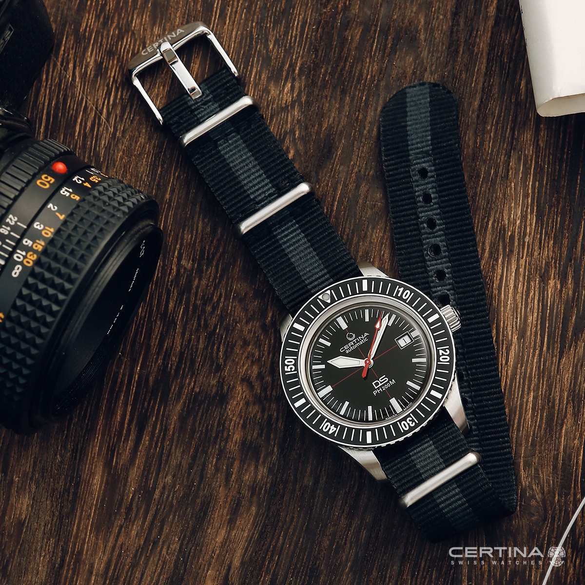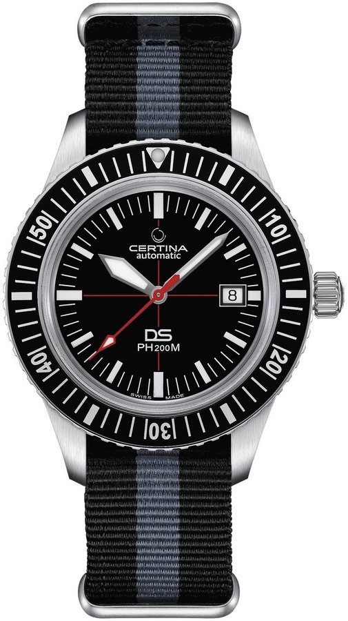 Certina DS PH200M Powermatic 80 C036.407.16.050.00 to męski zegarek automatyczny na skórzanym pasku z zapinaną na szpilkę klamrą, który swoją konstrukcją nawiązuje do kultowego już modelu PH200M z 1967 roku. Koperta ze stali nierdzewnej w połączeniu szlifowania i polerski ma średnicę 42,8 milimetra i jednokierunkowo obracający się bezel z aluminiową wstawką ze skalą nurkową. Dekiel oznaczony logo żółwia symbolizuje solidność i trwałość zegarków Certina. Czarna tarcza ze wskazaniem daty podzielona jest na sektory czerwoną linią i chroniona wypukłym szkłem Hesalite z warstwą NEX Scratchguard. Indeksy godzinowe wraz ze wskazówkami i bezelem pokryte są powłoką luminescencyjną Super-LumiNova®, która gwarantuje doskonałą czytelność przy słabym naświetleniu. Zegarek napędzany jest mechanizmem Powermatic 80.111 z naciągiem automatycznym i rezerwą chodu wynoszącą około 80 godzin. Ten mechanizm z funkcją hakowania można w razie potrzeby nakręcić także ręcznie za pomocą zakręcanej koronki. W modelu zastosowano technologię DS (Double Security), stosowaną i doskonaloną od 1959 roku, dzięki której zegarek ma zwiększoną odporność na uderzenia i wodę. Wodoodporność zegarka wynosi 20 ATM, co czyni go odpowiednim wyborem do snorkelingu i nurkowania. Model ten jest dostarczany w stylowym etui wraz z zapasowym dwukolorowym paskiem NATO.