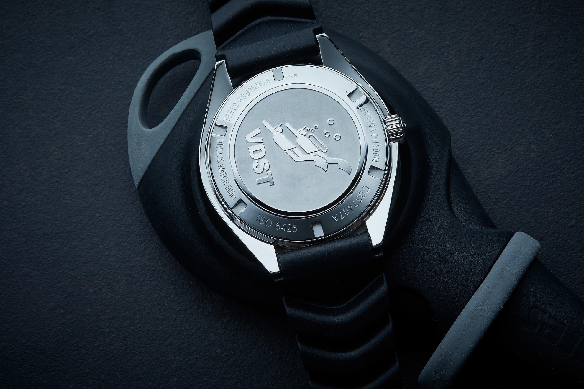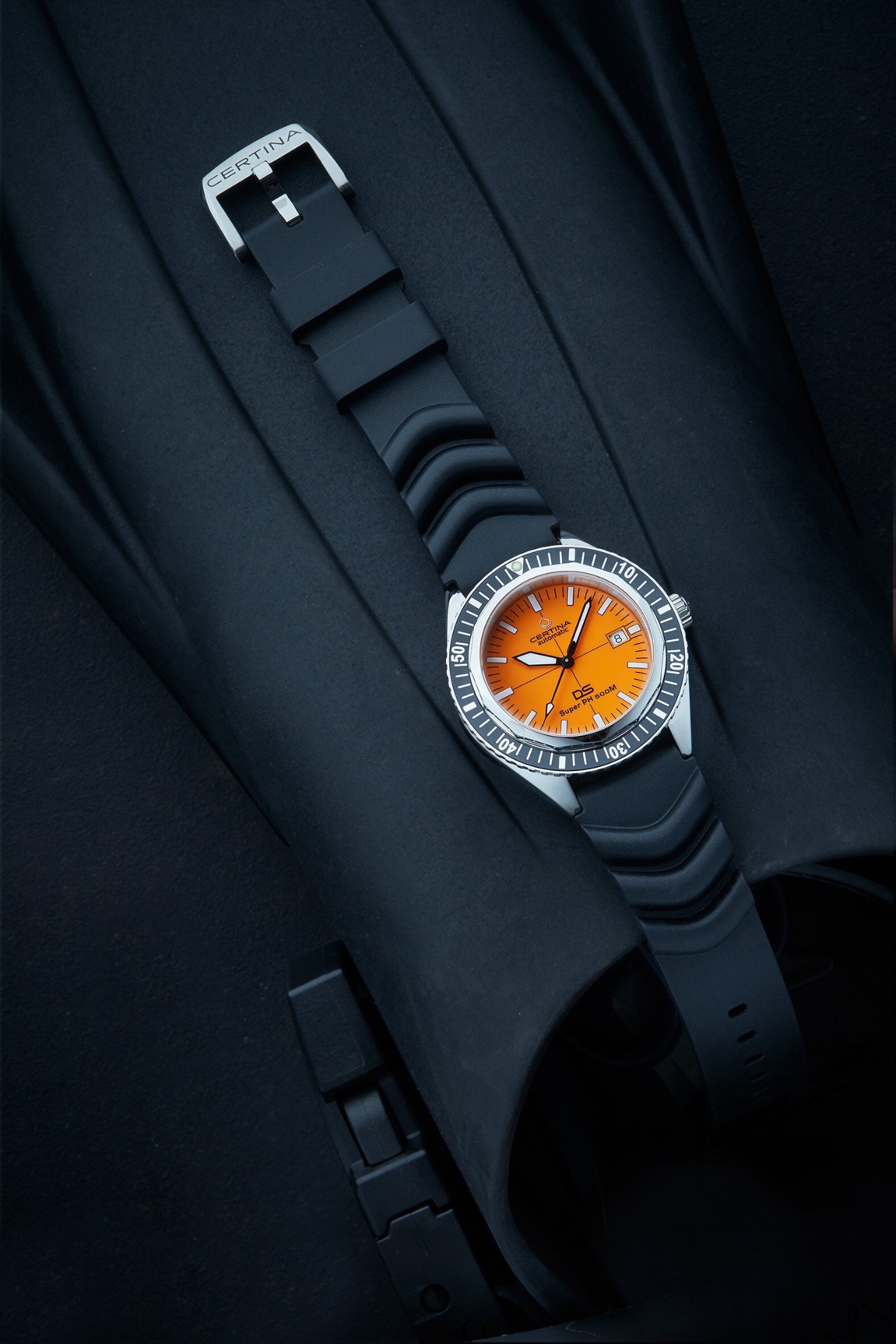 Certina DS Super PH500M C037.407.17.280.10 to męski zegarek automatyczny na gumowym pasku, wzorowany na modelu DS-2 PH500M z końca lat 60. XX wieku, od którego wywodzi się jego wygląd i niektóre funkcje. Koperta ze stali nierdzewnej w połączeniu szlifowania i polerowania ma średnicę 43 milimetrów, jednokierunkowo obracający się bezel z aluminiową wstawką ze skalą nurkową oraz dekluą oznaczoną logo niemieckiego stowarzyszenia nurkowego VDST , z jakim ten zegarek został przygotowany. Pomarańczowa tarcza ze wskazaniem daty jest podzielona liniami na sektory i zabezpieczona trwałym szkłem szafirowym z warstwą antyrefleksyjną. Indeksy godzinowe wraz ze wskazówkami i częścią lunety pokryte są powłoką luminescencyjną Super-LumiNova®, która gwarantuje doskonałą czytelność w warunkach słabego oświetlenia. Zegarek napędzany jest mechanizmem Powermatic 80.611 z naciągiem automatycznym i rezerwą chodu wynoszącą około 80 godzin. Kaliber jest wyposażony w koło zamachowe Nivachron™, które jest specjalnym materiałem antymagnetycznym, dzięki któremu zegarek jest wysoce odporny na pola magnetyczne. Mechanizm ten z funkcją hakowania można w razie potrzeby nakręcić także ręcznie za pomocą zakręcanej koronki. W modelu zastosowano technologięDS (Double Security), stosowaną i doskonaloną od 1959 roku, dzięki której zegarek ma zwiększoną odporność na uderzenia i wodę. Zegarek jest wodoodporny do 50 ATM i posiada certyfikat ISO 6425, dzięki któremu jest odpowiednim wyborem do nurkowania według wskazań przyrządów.